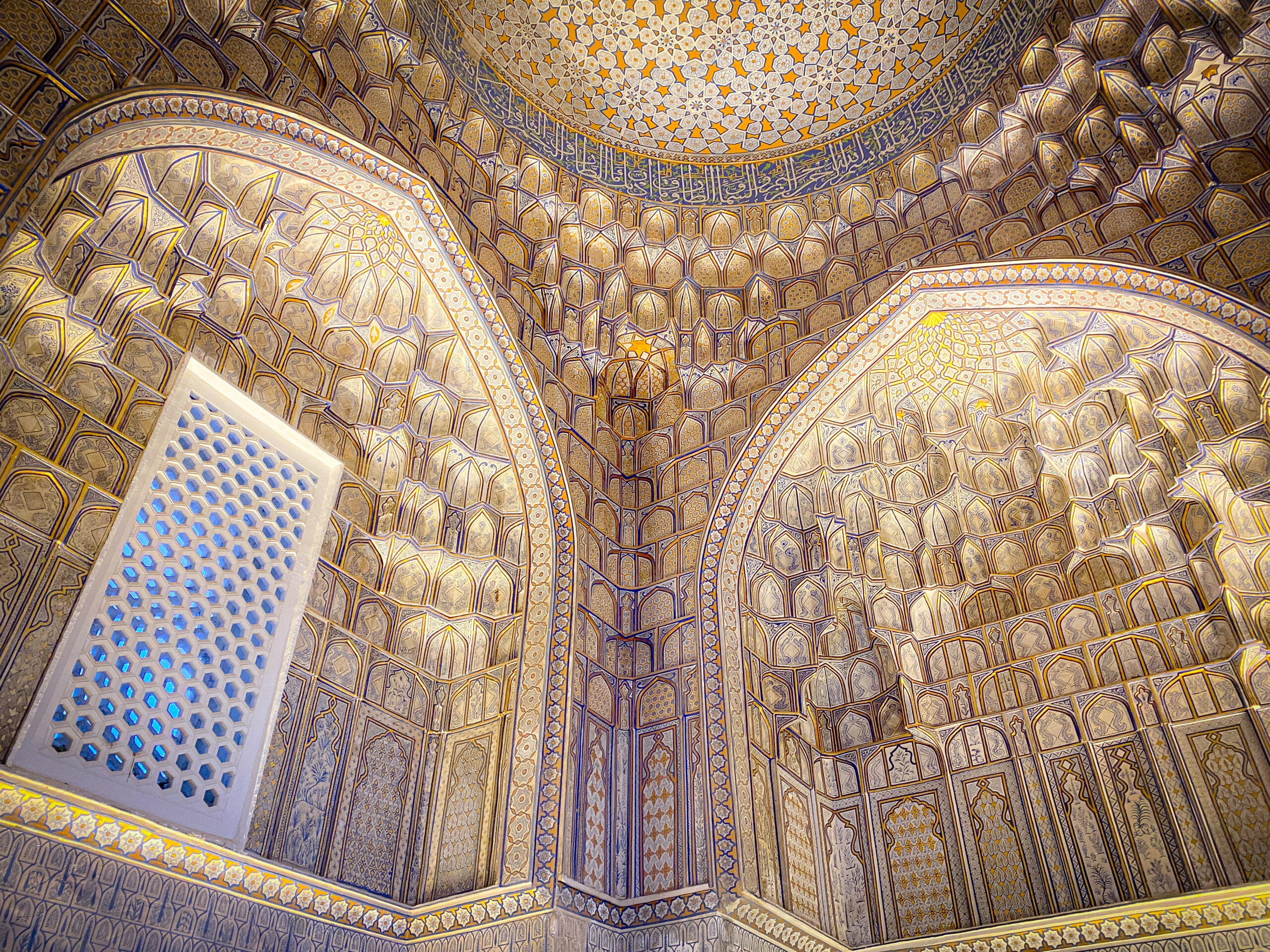 どの廟も息をのむ美しさですが、最も美しいと言われているのがシャーディムルク・アカ廟。シャーディムルク・アカは、ティムールに愛された姪なんだそうです。浮き彫りのタイルが多用された空間は、天井も壁も美しすぎて、いつまでも見ていられます。