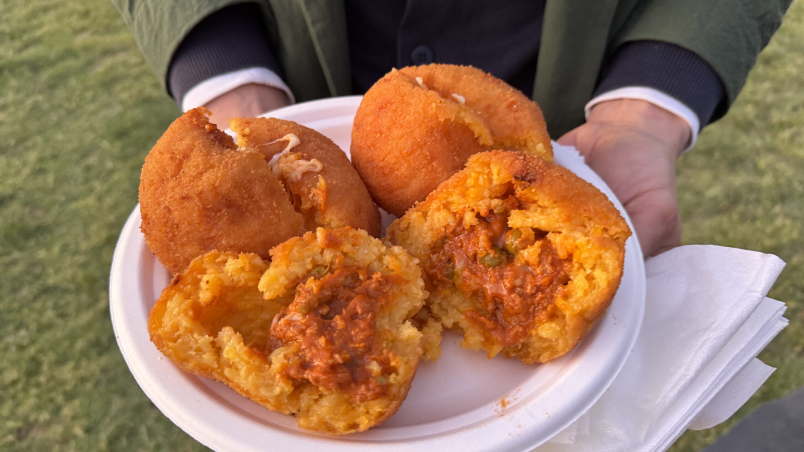 シチリアの郷土料理アランチーノのトラックもありました。具沢山のリゾットを揚げたおにぎりのようなライスコロッケで、食べ応えはバツグンです。チーズがトロ〜〜〜と伸びて、ちびっこも大好きです。