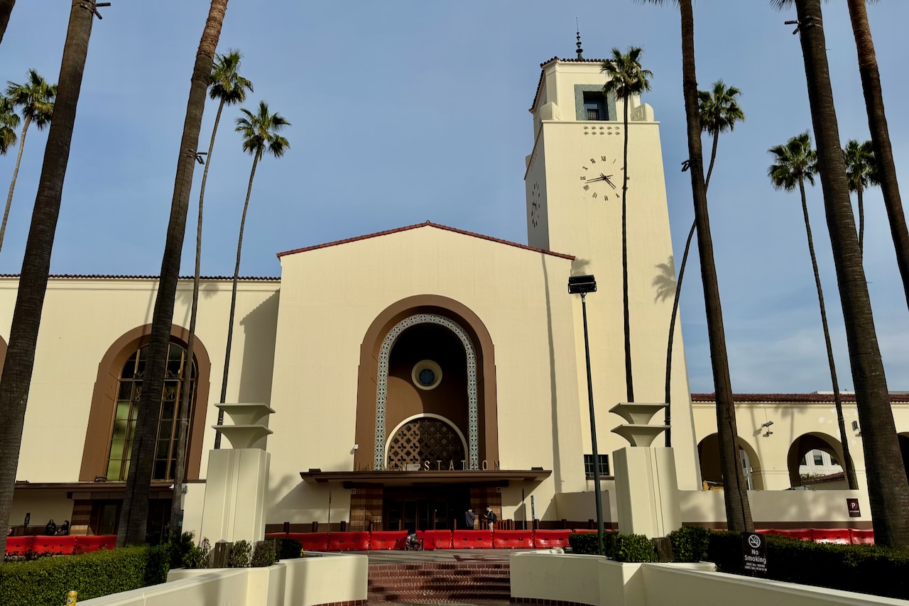 ユニオン駅は、アメリカ西部最大の鉄道旅客ターミナルで「最後の偉大な鉄道駅(the last of the great train stations.)」と言われています。建築家親子のジョンとドナルド・パーキンソン(John and Donald Parkinson)によって設計され、1939年に完成しました。ちょうど鉄道の駅が小型化されている頃だったので、一般的なユニオン駅より小ぶりな駅舎です。スパニッシュコロニアル・リバイバル(ミッション・モダン)とアールデコ建築を融合させた様式。見上げるほどのパームツリーが並ぶ雰囲気がカリフォルニアらしいし、通路など歩くのがもったいないほど見事なモザイクの床、どっしりとしたレザーシートずっと座っていたくなります。とにかく高い天井がまとこにエレガントであっぱれ。なるほど撮影にもよく使われるようです。