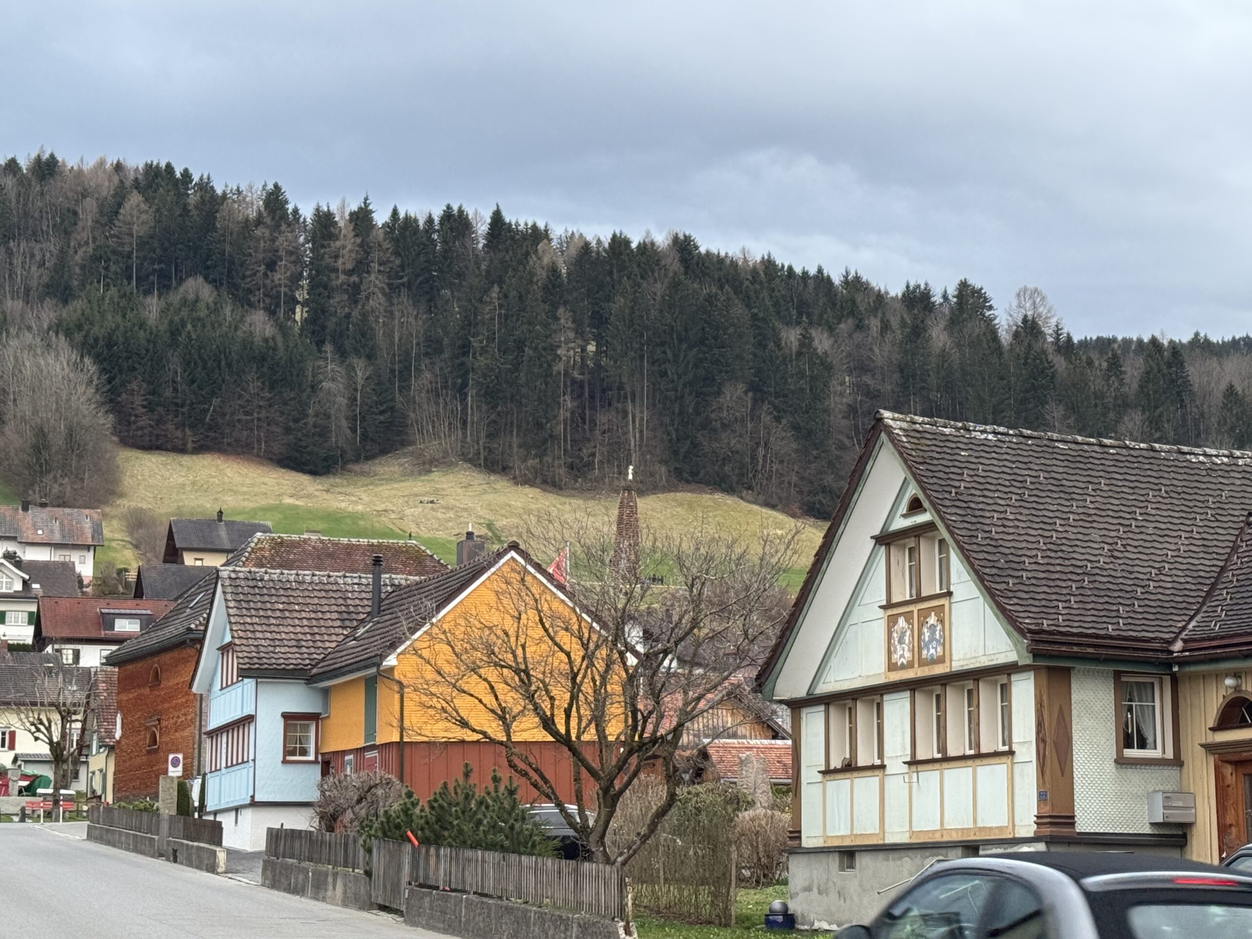 私は傾度30度くらいの丘を30 mほど登ったところまで移動。まわりには誰もいなくて、塔やゲストハウスだけではなく遠くのアッペンツェルの教会やなだらかな山々を見渡せる絶好の場所でした。