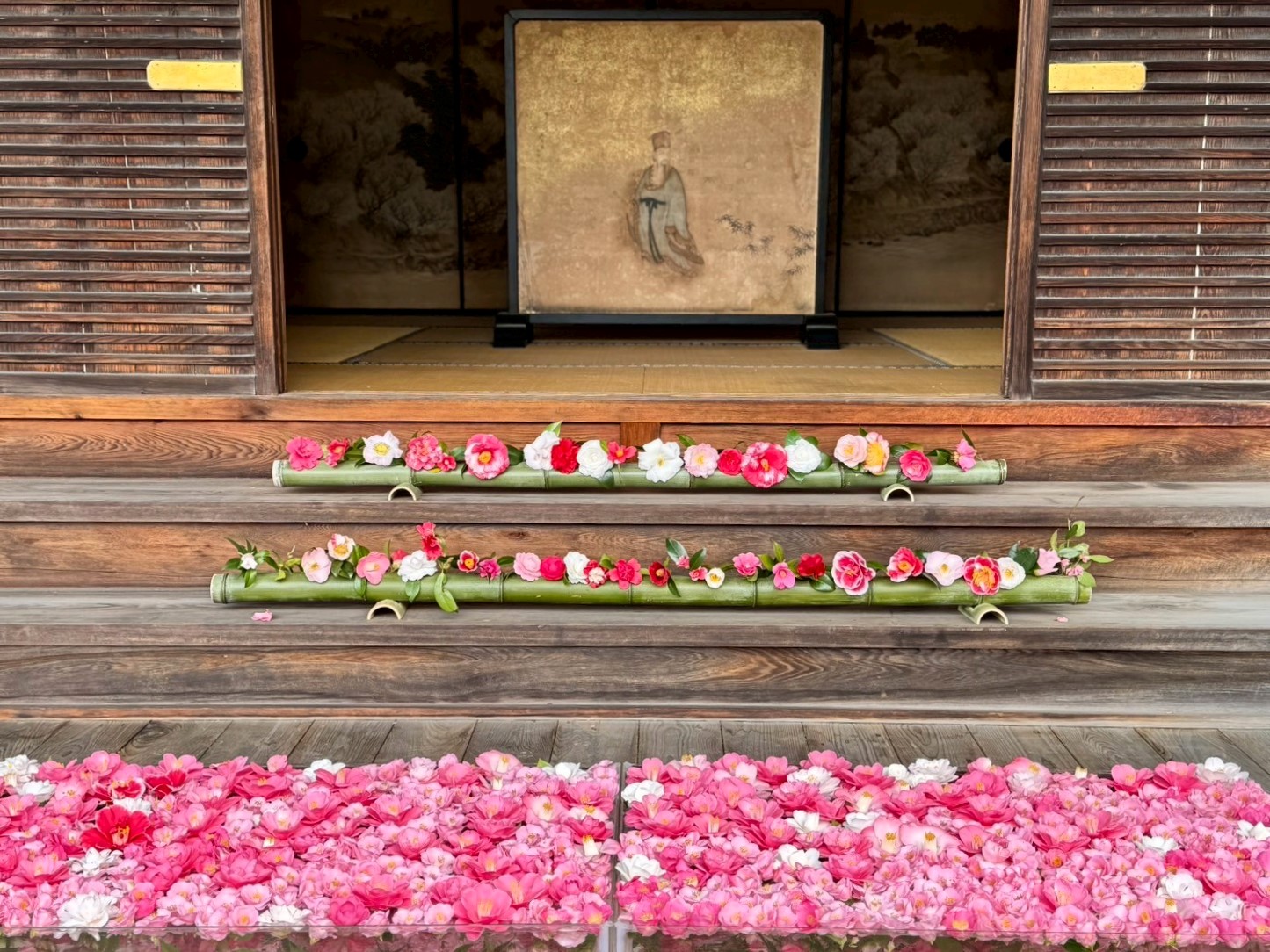 「椿の寺」の名にたがわず、目につく場所全てで椿を楽しむことが出来ます。中でも人気なのは、御朱印帳の表装にもなっているローゼフローラの落ち椿です。新緑の苔とのコントラストが美しく、多くの方が思わずスマホ・カメラを取り出していました。また、入り口近くに設置されている巨大なアクリル水槽のお花は、毎朝ご住職が新鮮なお花に入れ替えていらっしゃるとか。何度足を運んでも違った表情を見ることが出来るため、リピーターも後を絶たないそうです。