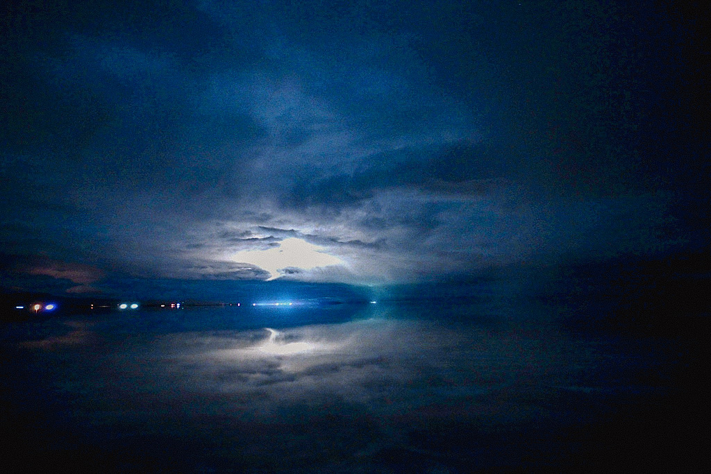 対岸にはリチューム鉱山の明かりが煌々と雲を照らしていました。