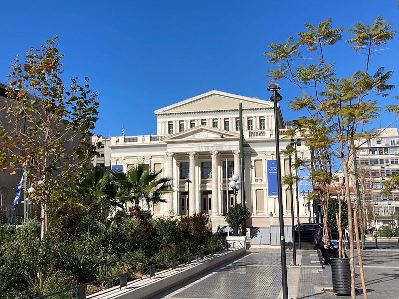 ディモティコ・シアトロ駅を出ると、目前にあるのが駅名にもなった劇場。そして背後には優しいクリーム色の聖コンスタンティン&ヘレナ教会があります。劇場は上演がない限り閉まっていますが、教会は朝から開いているので立ち寄ってみてはいかがでしょう。