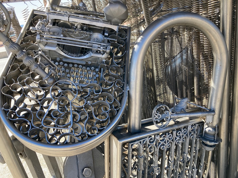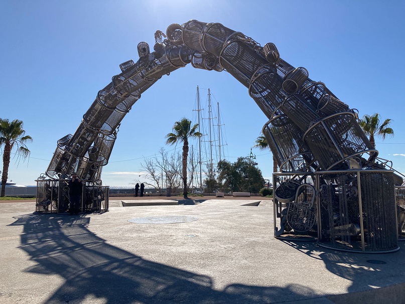 海を一望するプロムナードを歩いていくと、アーチ型オブジェが見えてきます。近付いて見ると機械や楽器やタイプライターなど様々な金属廃材を利用した、複雑で重厚感ある作品。