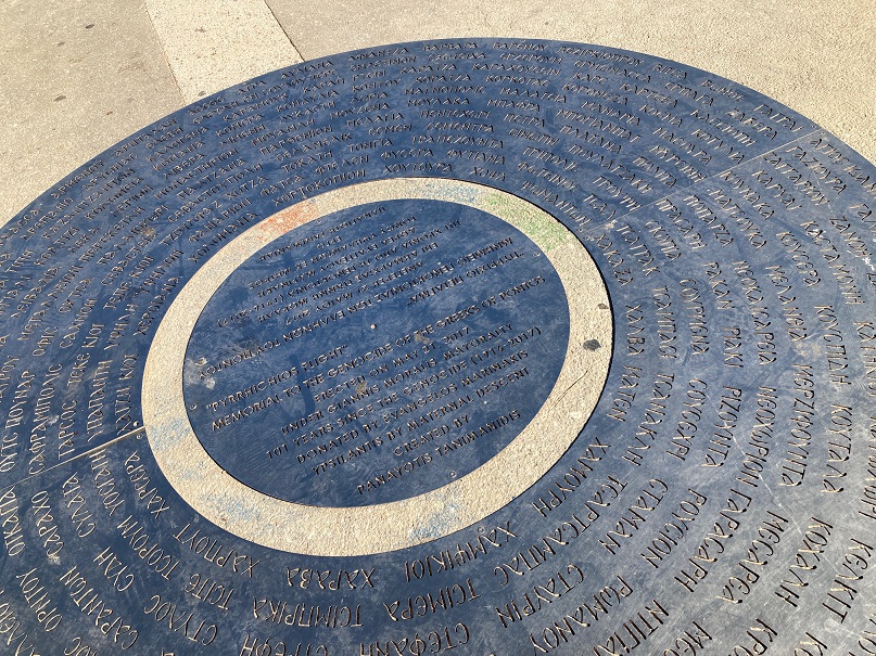 地面にはめ込まれたプレートには、ポントゥス地域でのギリシャ人虐殺の慰霊モニュメントと表記。ポントゥスは現在のトルコ北西部で、オスマン帝国時代は多くのギリシャ系住民がいた地域です。