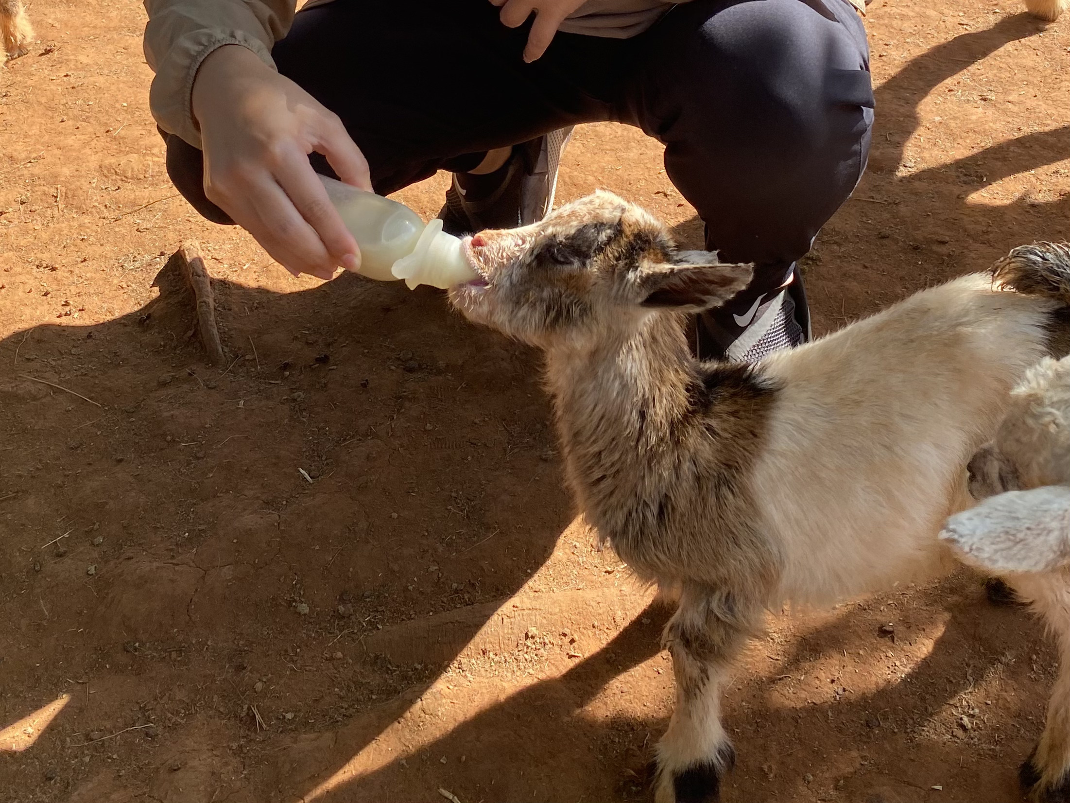 ミルクの試飲以外にも、子ヤギへのミルクやりや乗馬、動物への餌やりもあります。