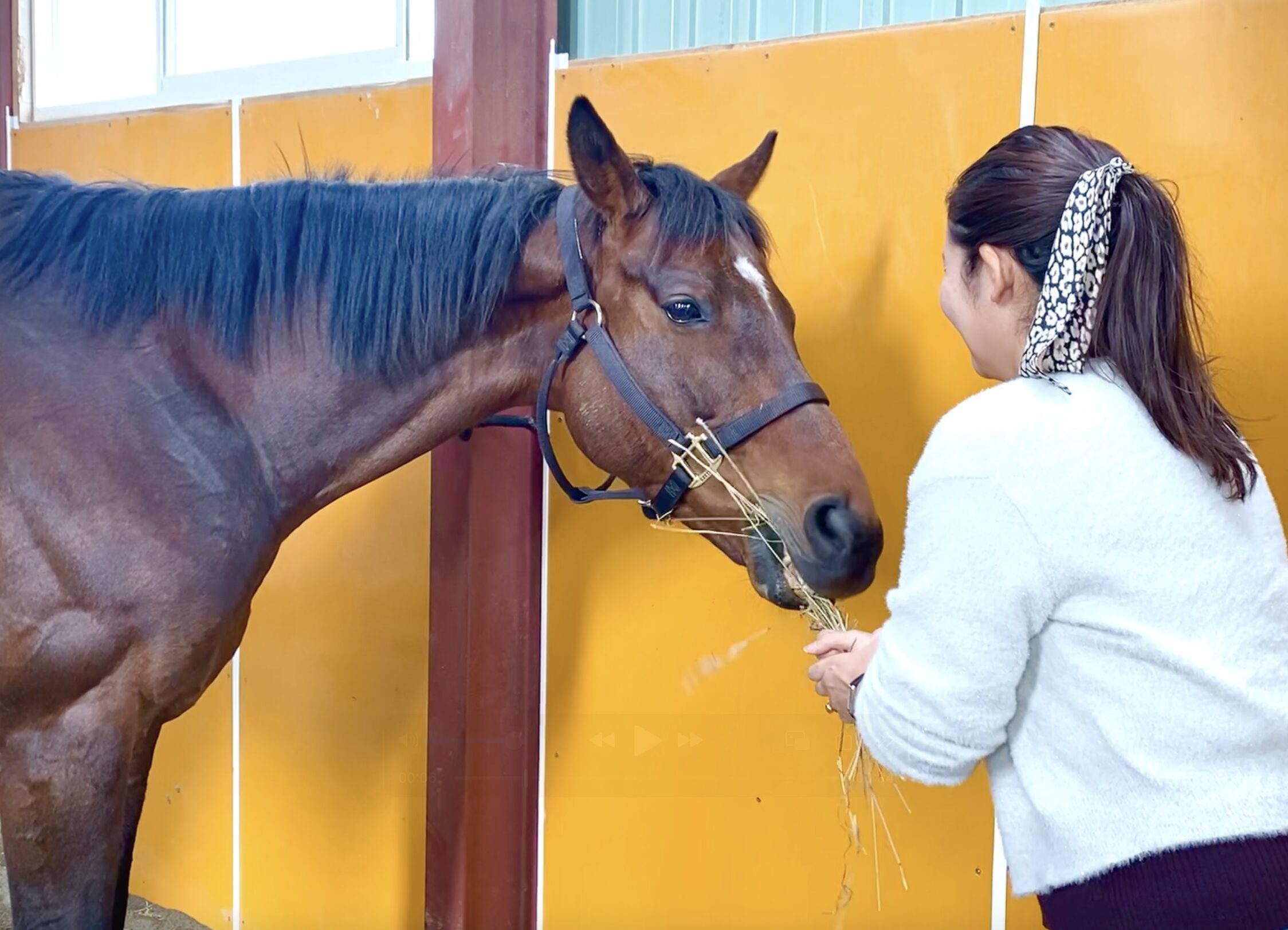 到着して乗馬の受付を済ませたら、早速、馬とご対面。まずはこちらで馬と触れ合います。お伺いした日は、クロノス、ジャスミン、クイーンの3頭が待っていてくれました。自分が乗る馬にご挨拶をして、基本動作を教えていただいたら、いざコースへ。一人だと不安…という方もいらっしゃるかと思いますが、すぐそばにガイドさんがいてくれるので安心して体験できるのも魅力です。