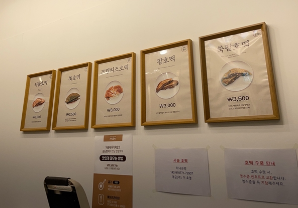 ホットク(호떡)とは韓国の屋台料理の一つで、小麦粉やもち米粉で作った生地の中に砂糖やシナモンなどを入れて、油いっぱいの鉄板の上で平らにして作るおやつです。小腹が空いたときにぴったりで、熱々もっちりしています。韓国では屋台で買って食べ歩きするのが定番ですが、ソウルホットクはお店で販売されています。メニューを見ると、普通のホットク以外によもぎホットク(スックホットク・쑥호떡)、クリームチーズホットク(크림치즈호떡)、小豆ホットク(パッホットク・밭호떡)、よもぎ小豆ホットク(スックパッホットク・쑥팥호떡)の5種類あります。価格は2,000ウォン~3,500ウォンと屋台で購入するより少し高めです。