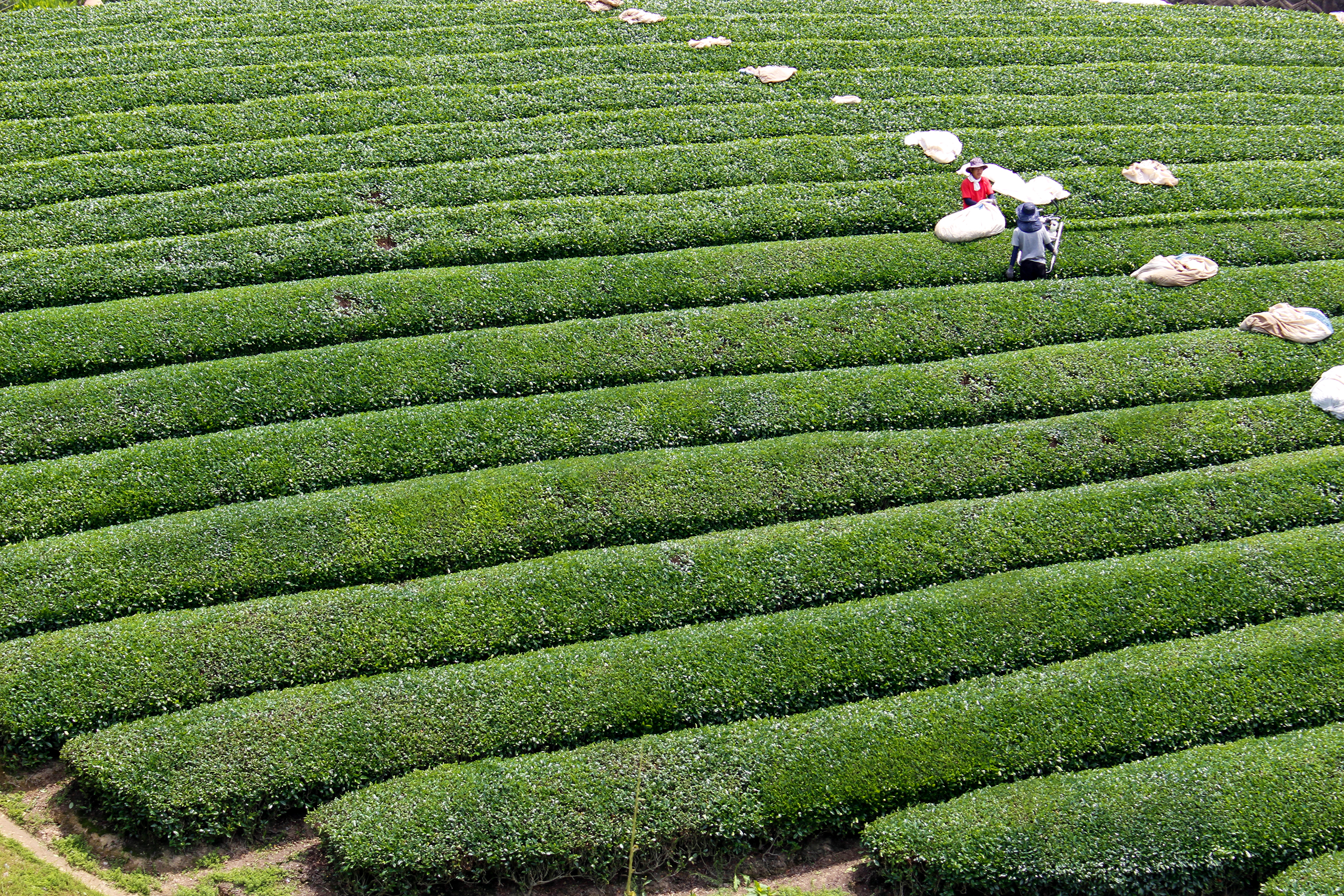 和束町は奈良平城京と宇治平等院とのほぼ中間にある京都府南部にあるまちです。京都府民であればお茶の産地であることは常識なのですが、その生産量と茶畑の絶景は意外と知られていません。撮影に訪れたのは5月の中旬で、お天気にも恵まれて美しい景色が広がっていました。町内にはいたるところに茶畑がありますが、まずは最も有名な「石寺の茶畑」へ。石寺地区は茶畑の合間に瓦葺きの家屋が点在し茶畑景観と集落が一体となった景観が広がります。江戸時代は果樹と水田が主な地域で、茶畑は近代以降に広がりました。この茶畑と暮らしの景観は、2008年に京都府景観資産第1号に登録され、2015年には日本遺産に認定されました。
