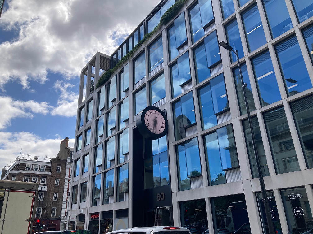 前述した動物たちの作品からすぐ近くには、時計に閉じ込められちゃった男性もいますよ!こちらはイーストボーンテラス通り50番地、複合オフィスビルの入口上部に設置されています。