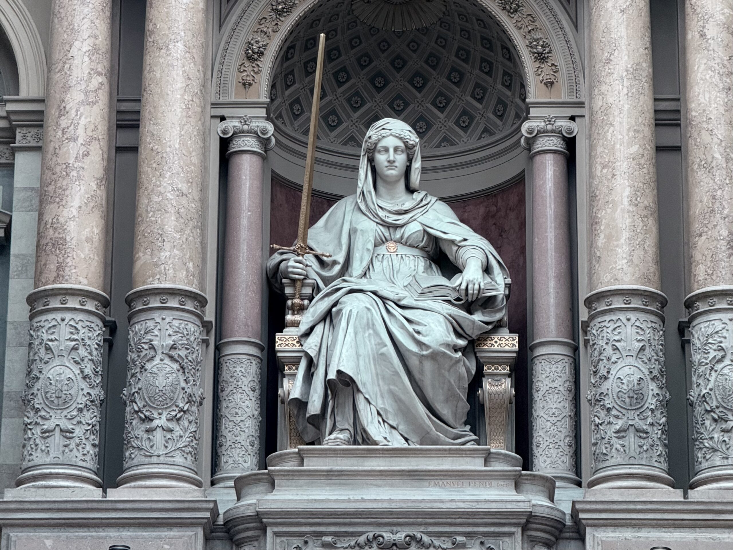 中央階段奥に鎮座するのは、厳粛な雰囲気ある黄金の剣と本を持った堂々たる正義の女神像。