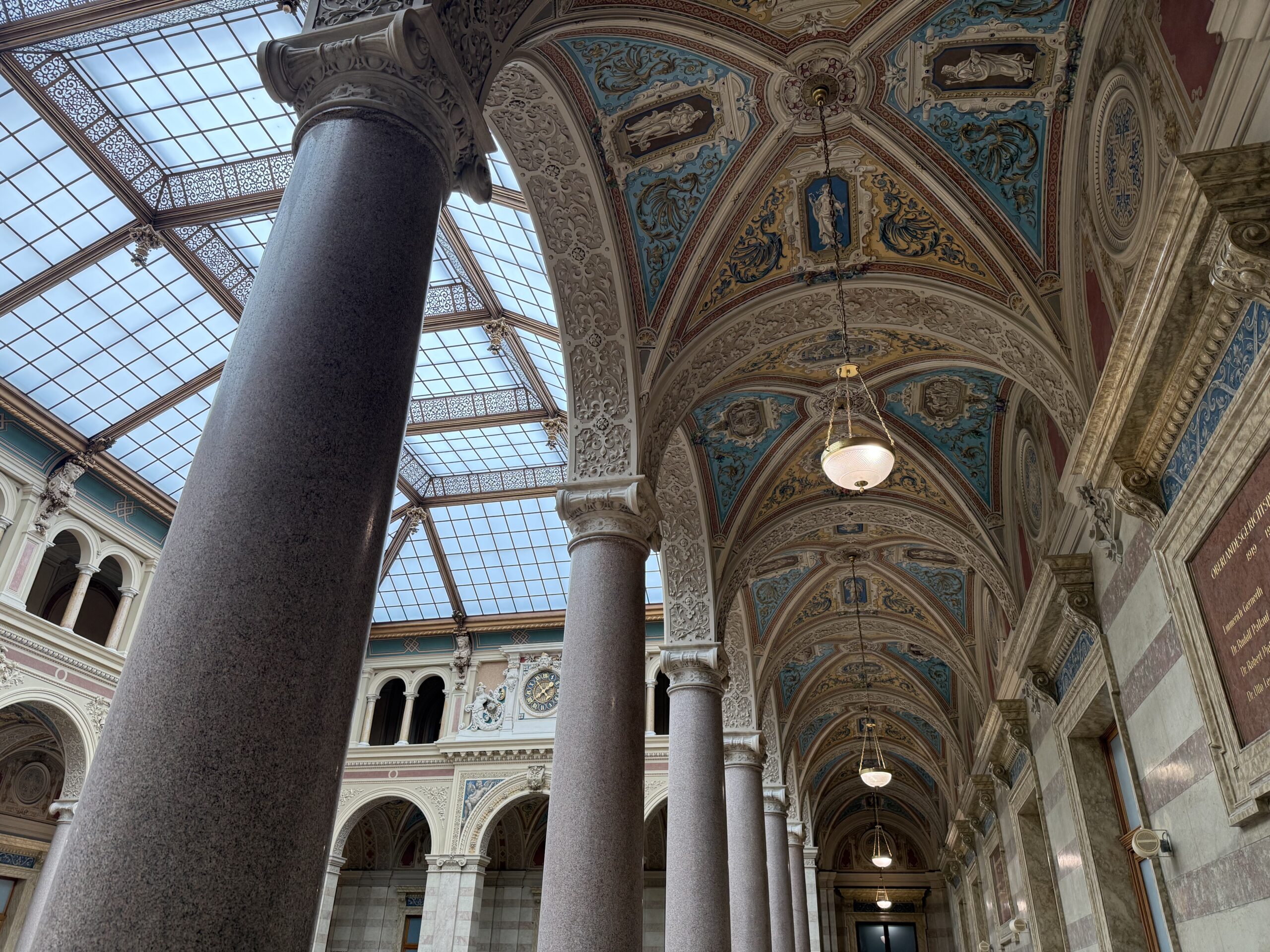 場所は、オーストリア国会議事堂(こちらも見学できます)と自然史博物館に挟まれた通りに位置しています。2頭のライオン像が目印です。