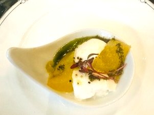 桃を酸味のあるシロップで真空加熱し、フレッシュな風味を引き出したカプレーゼ。バジルの香りとともに、夏の前菜にぴったり。