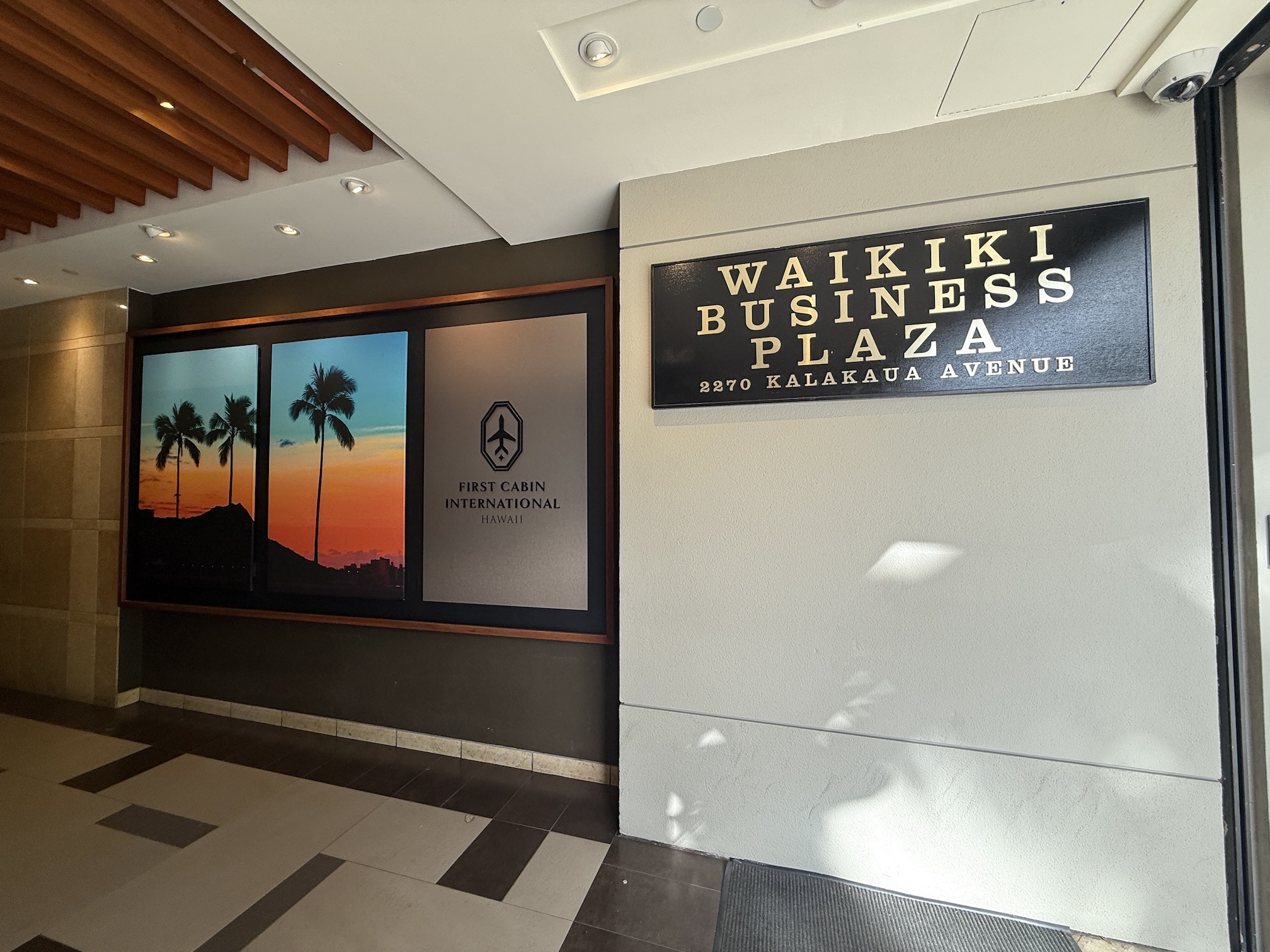 当日はウーバーでワイキキへ。ホテルはカラカウア通りとシーサイド通りの角、ワイキキ・ビジネス・プラザの14階にあります。カラカウア通りから建物に入って、突き当たりを右に曲がるとエレベーターが4基。14階で降りると、キーパッドがあり、送られてきたコードを入力すると入室可能です。