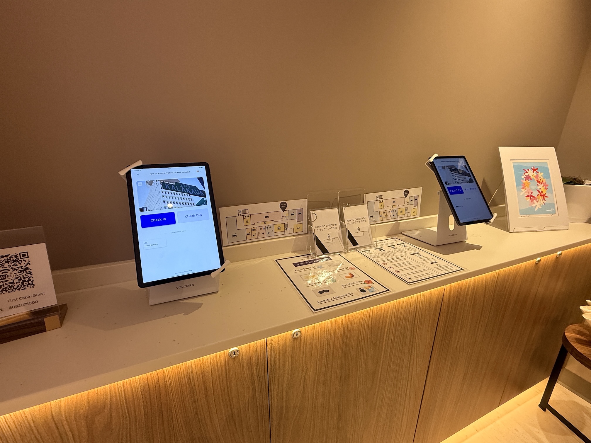 入室して右側に進むと、フロントデスクがあります。フロントデスク前にはタブレットがあり、ここで顔写真の撮影とチェックインを行います。私は事前登録済みだったので数分で完了。パスコードは部屋やキャビン、トイレ、ロッカーなど至る所で必要なので、写真を撮って保存しておくのがおすすめです。