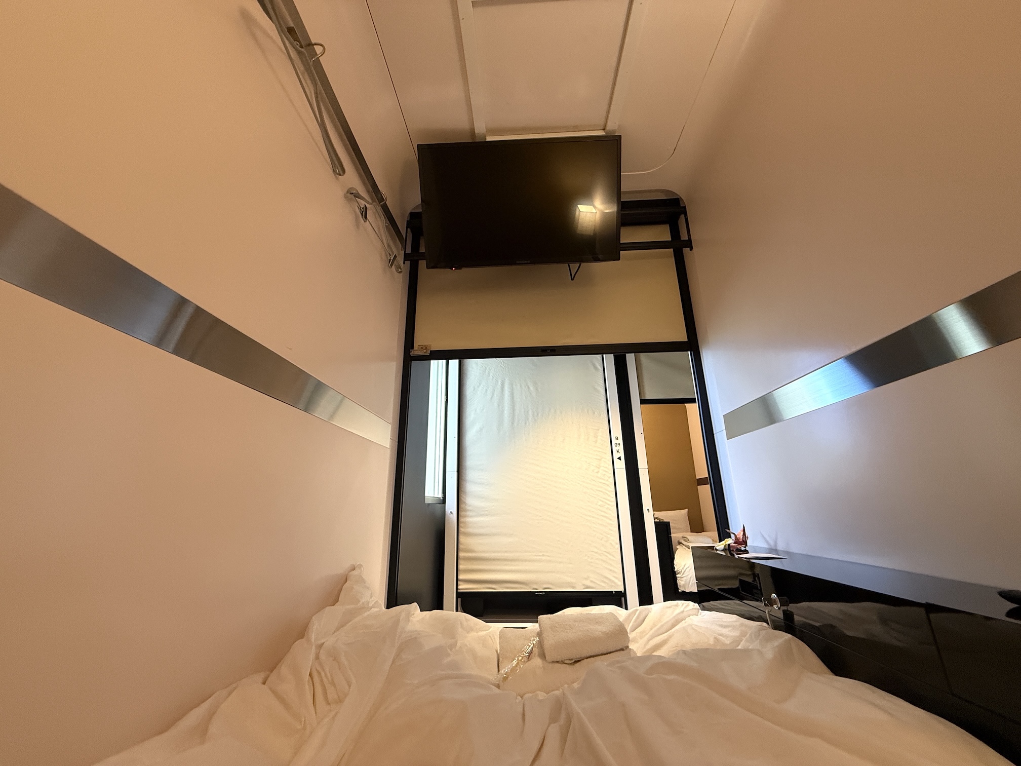 お部屋のタイプは3種類あり、プレミアムエコノミープラス(2.8㎡)、ビジネスクラス(2.5㎡)、ファーストクラス(4.4㎡)と、飛行機の座席のような名称がユニーク。各キャビンの高さはプレミアムが1.05mと二段ベッド風、他は2.10mで圧迫感なし。私が選んだのはビジネスクラスで、寝相の悪い私にはちょうどよい広さでした。