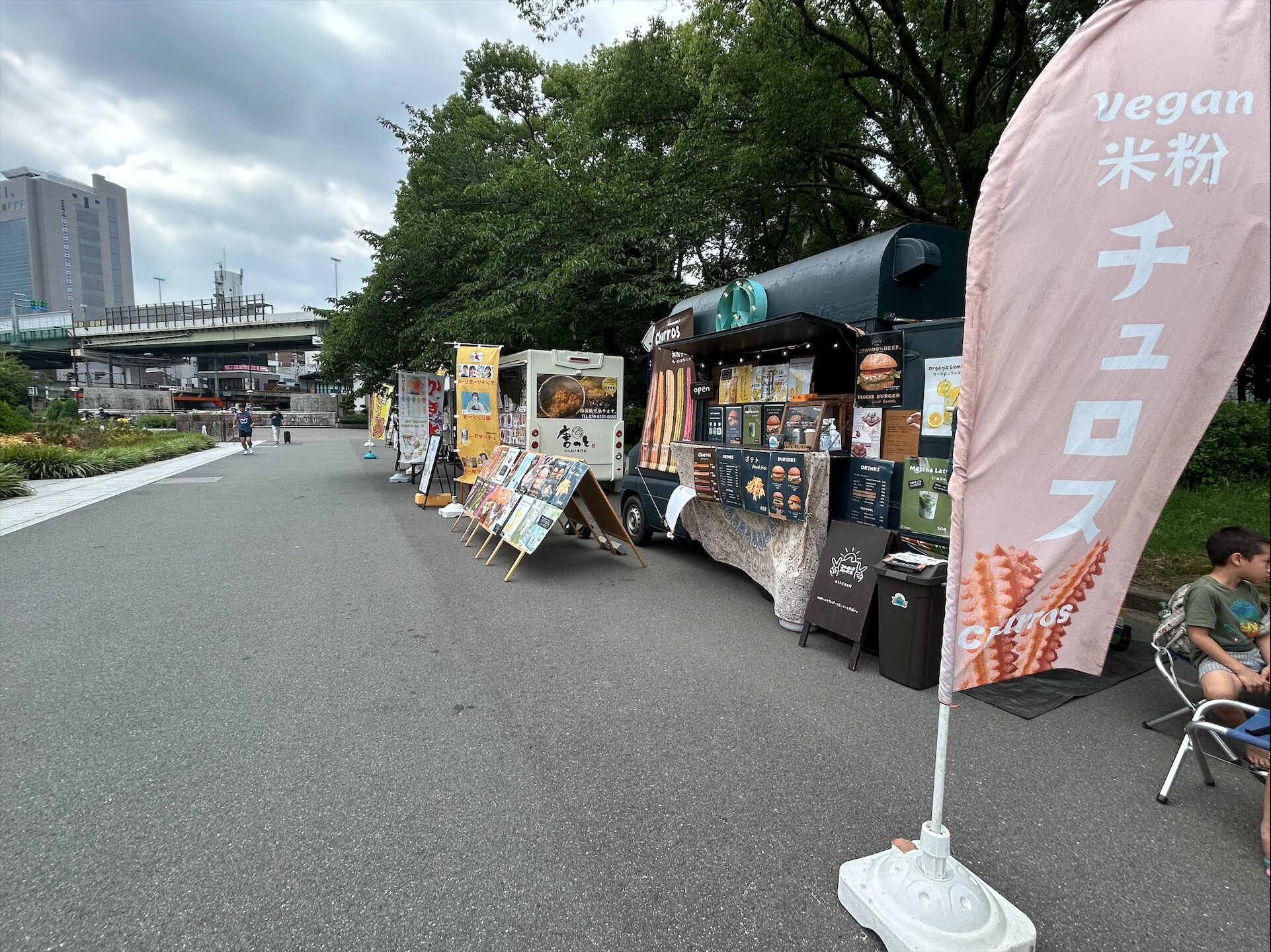 公園内に入るとすぐにいくつかのフードトラックが目に入ったので、少し涼むために休憩しました。