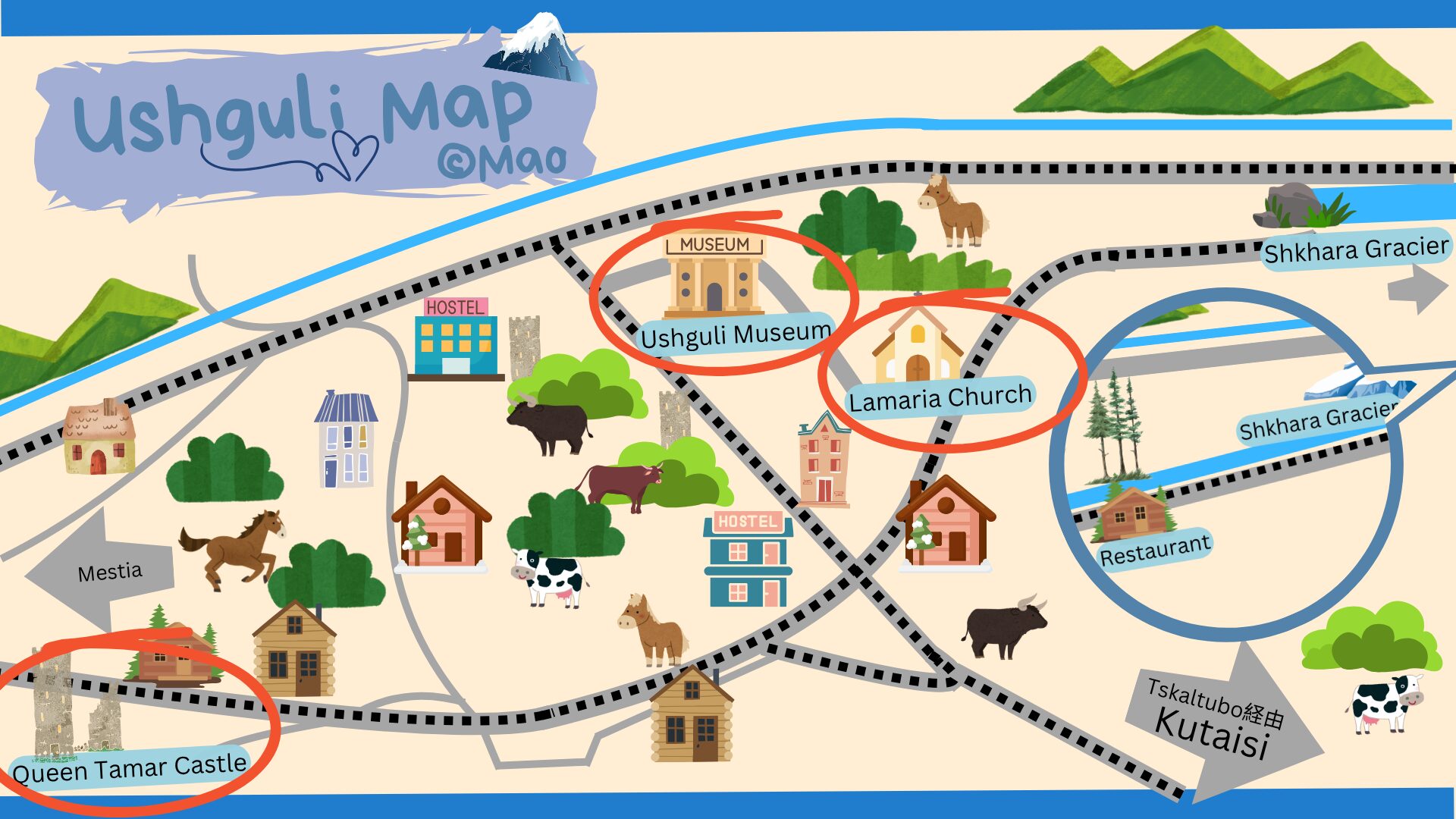 今回紹介した3つの他にも、先日紹介したシュハラ山麓に氷河や、メスティアからの道中にある愛の塔など様々なオススメポイントがあります。またウシュグリ村は5000m級の山に囲まれているので、雲さえ無ければどこを歩いても最高峰が垣間見え、絵になります。