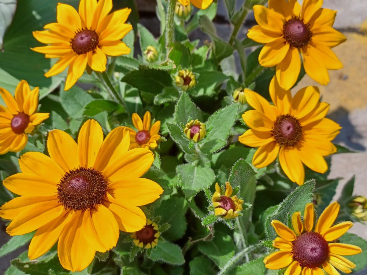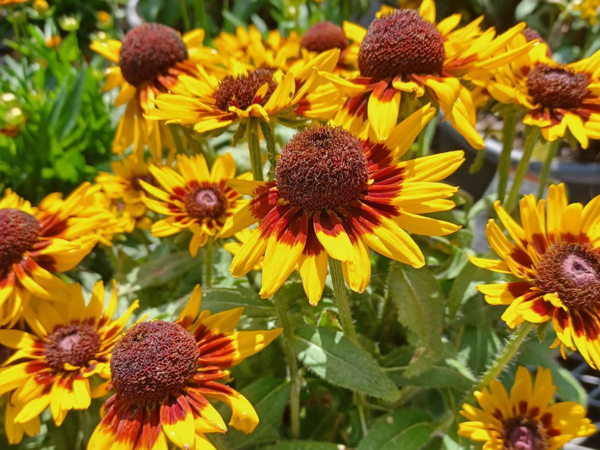 花の大きさはデイジー(ヒナギク)に似ていますが、ひまわりのようにあざやかな濃い黄色の花びらと、花の中心にある、茶黒いクルミボタンのような硬い管状花(筒状花)が特徴です。開花時期は5月から8月、高さ(草丈)は約1メートルほどまで成長します。
