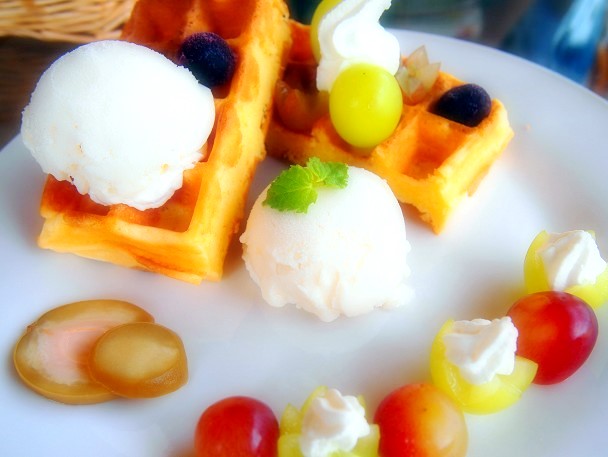 右のワッフルには、マスカットや巨峰などの葡萄に白桃のジェラートが添えられ目にも鮮やかですね。ワッフルの手前にあるのは、スライスした白桃のピクルスです。甘じょっぱい味が、葡萄や白桃のジェラートの甘さをひきたてています。