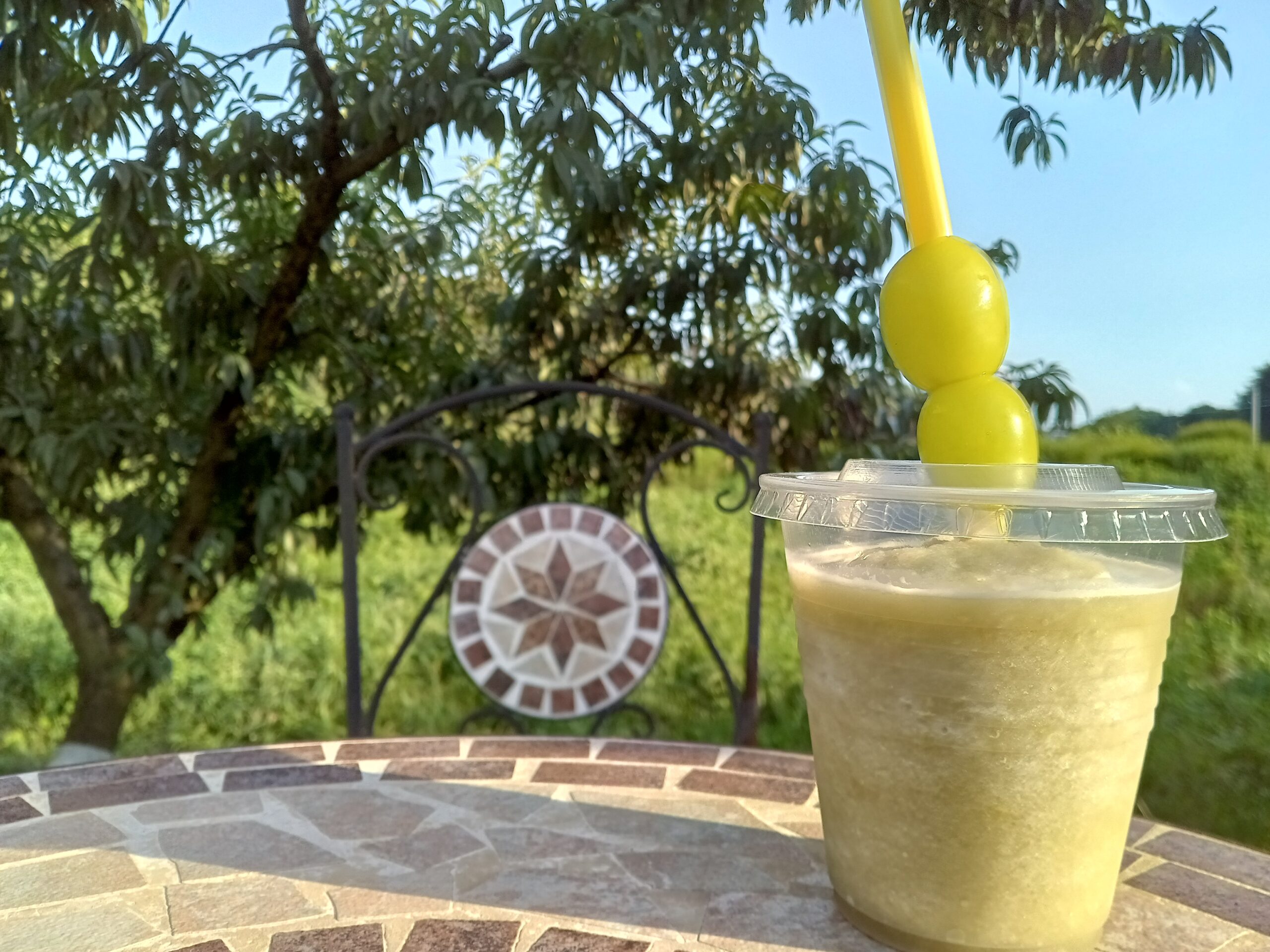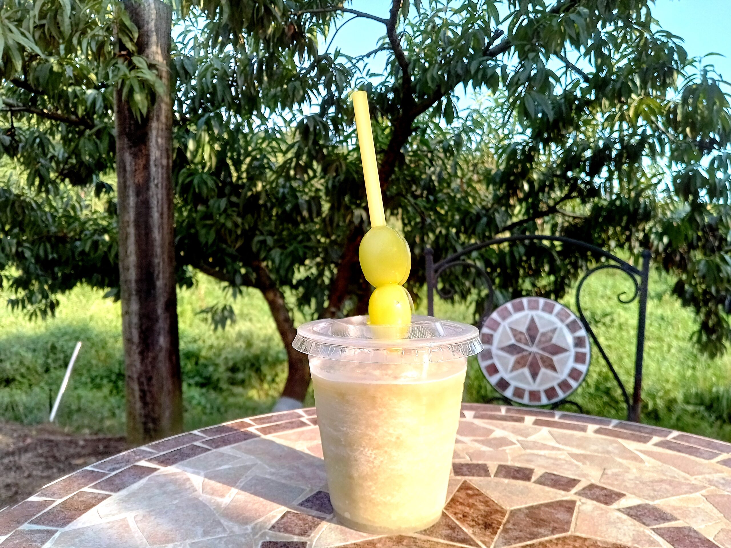 マスカットスムージーのストローには、マスカットが丸ごと刺さっているユニークな姿、マスカットの爽やかな甘みと芳醇な香りをしっかりと堪能できるスムージーでした。シャインマスカットなどの葡萄は、氷温保存の技術でほぼ年間を通していただけるそうです。