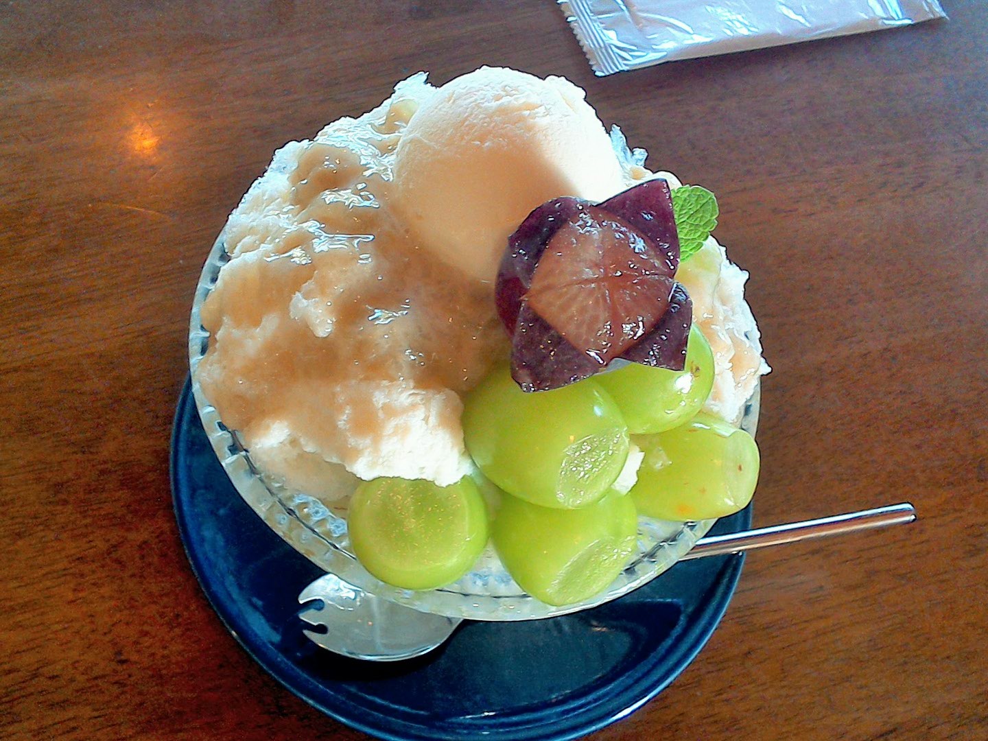 一押しのスイーツは、シャインマスカットと巨峰がたっぷりのったかき氷です。アイスの上には、ぶどうの粒感のあるシロップがかかり、かき氷の中からさらにシャインマスカットが出てくる贅沢なかき氷で、さっぱりとした甘さです。