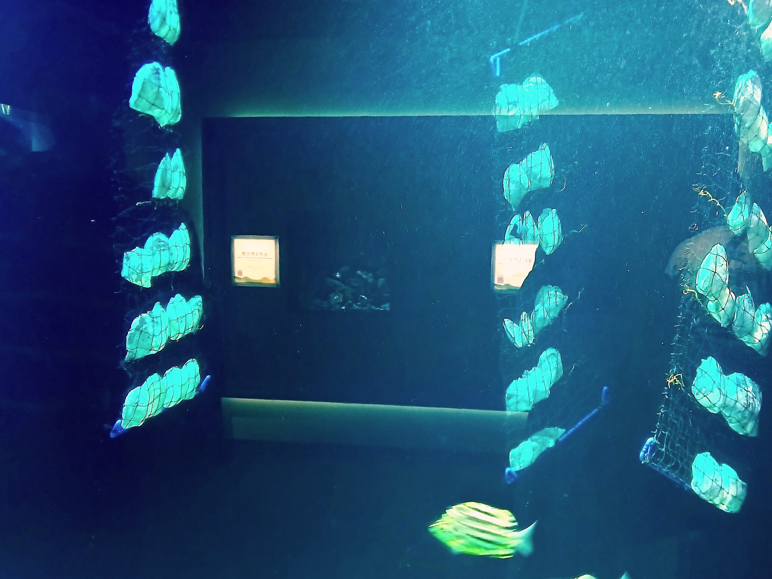 左の水槽は、牡蠣?と思ったら、真珠の養殖に利用するアコヤガイでした。愛媛県の宇和島は真珠の養殖で有名ですね。