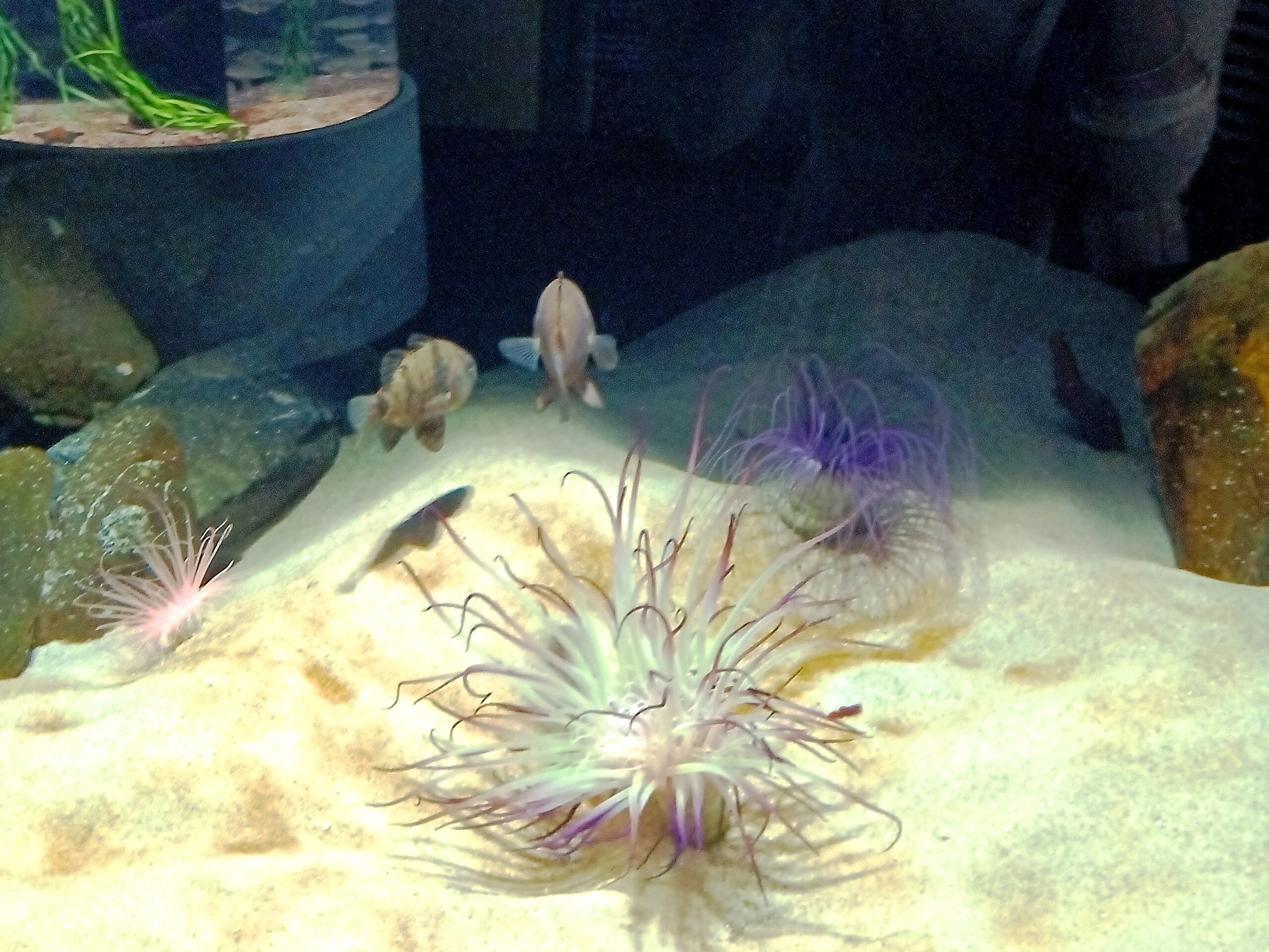 中でも一番目を惹いたのが、色彩豊かなお花畑のような水槽です。ライトアップで色をつけているのかと思ったら、イボヤギというイソギンチャクの仲間ですよ!
