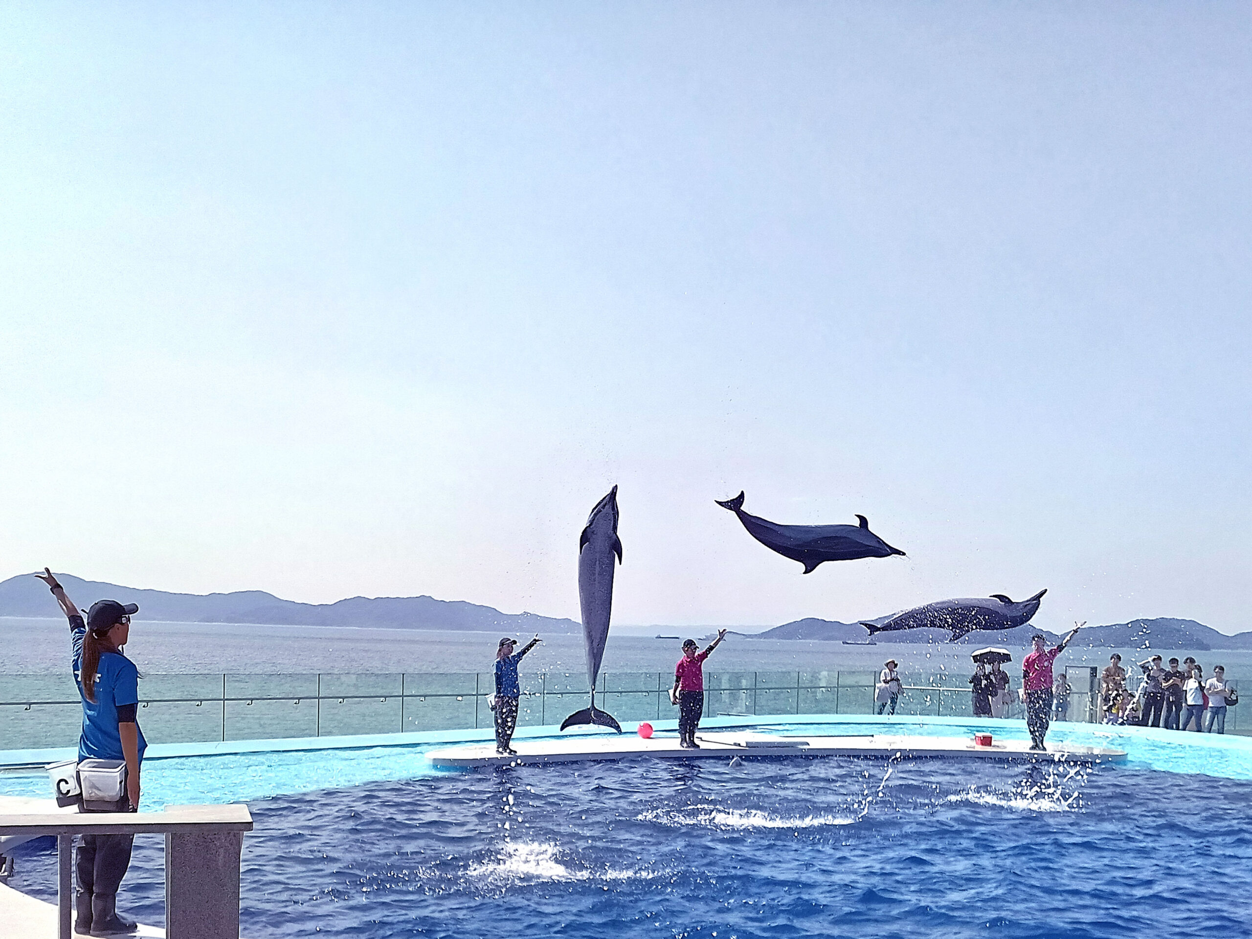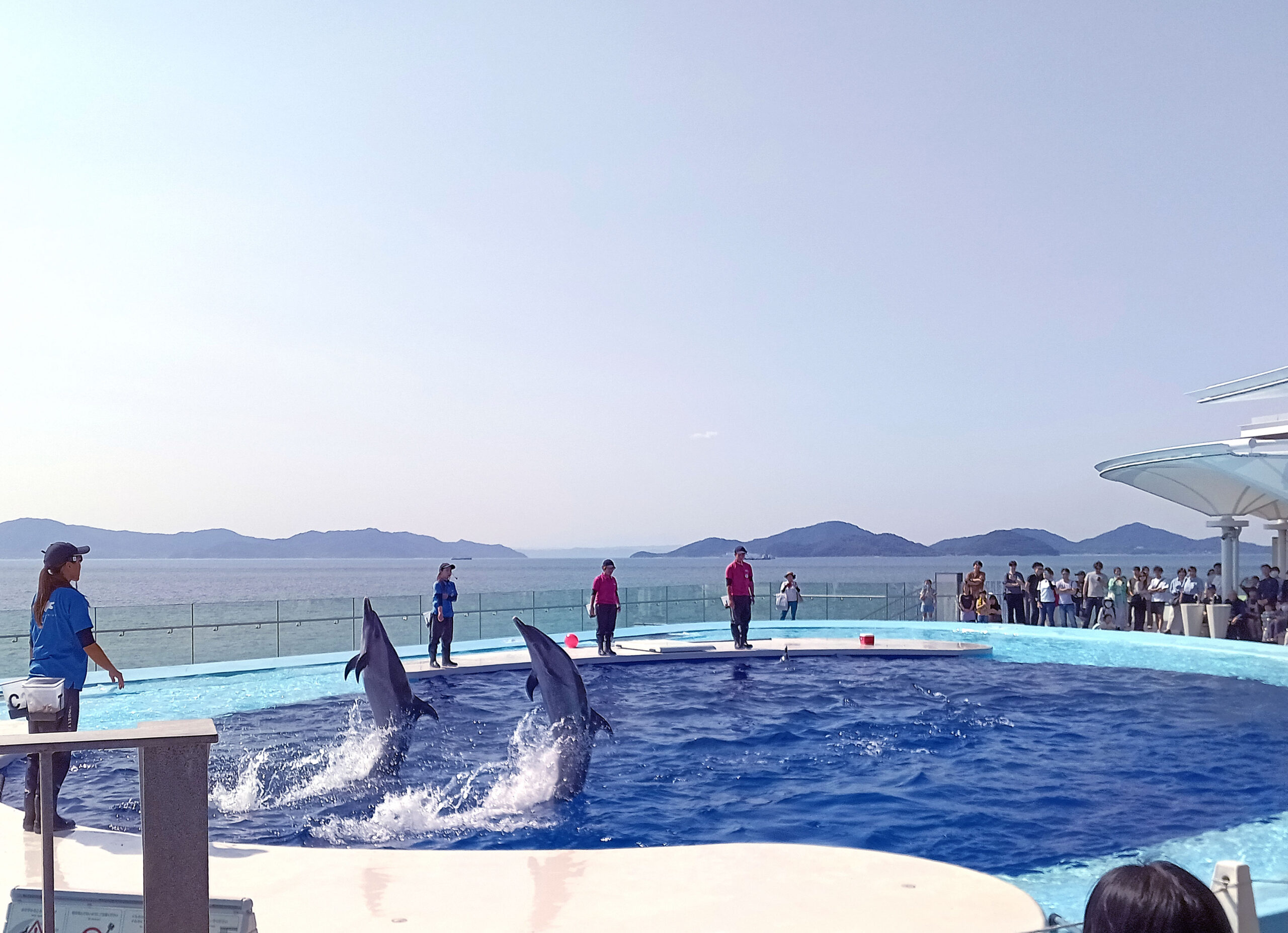 イルカのプールは瀬戸内海が背景になり、夕暮れどきになると沈む太陽と夕焼けをうけて、ジャンプするイルカ達の姿が楽しめるそうです。