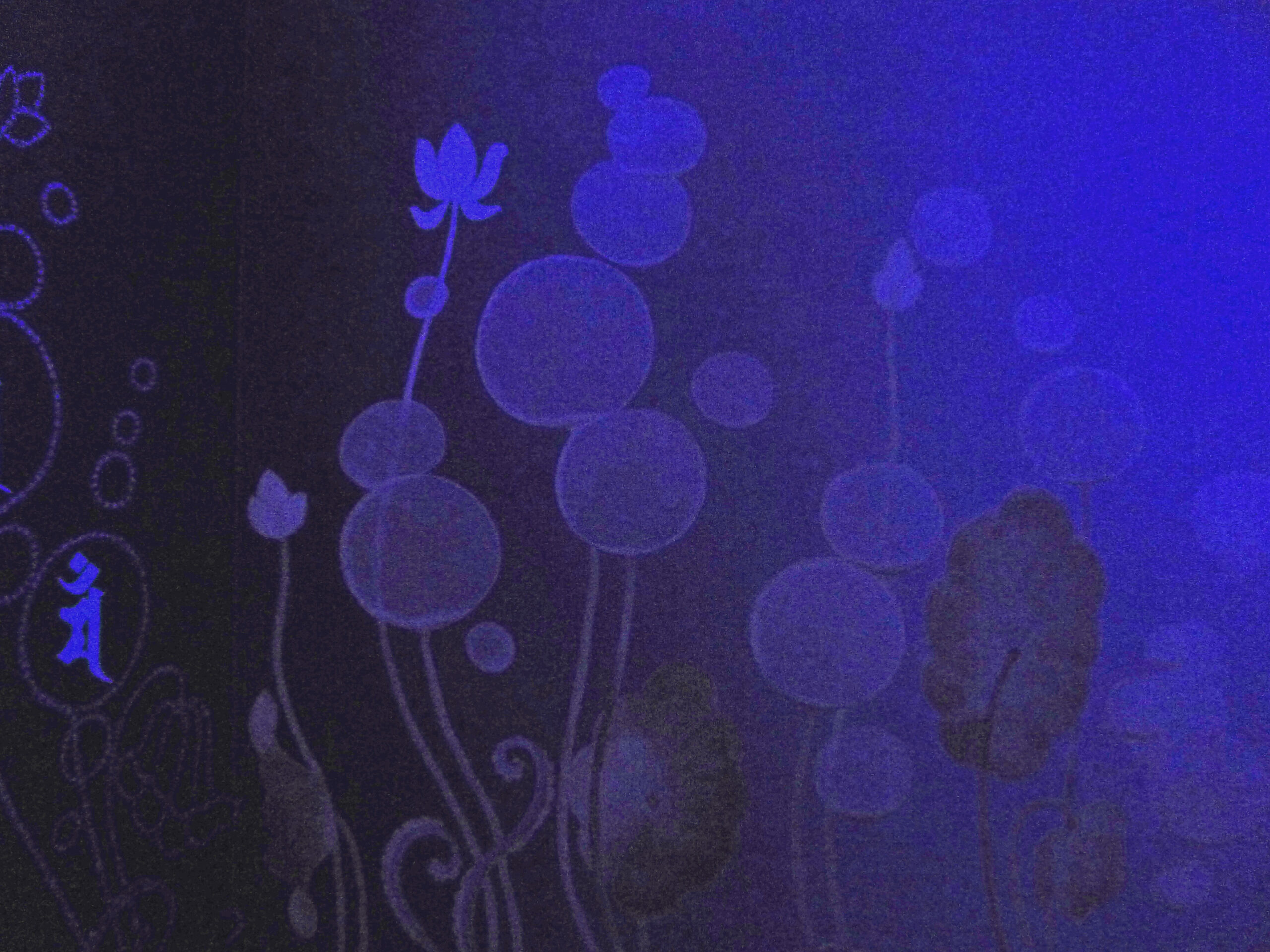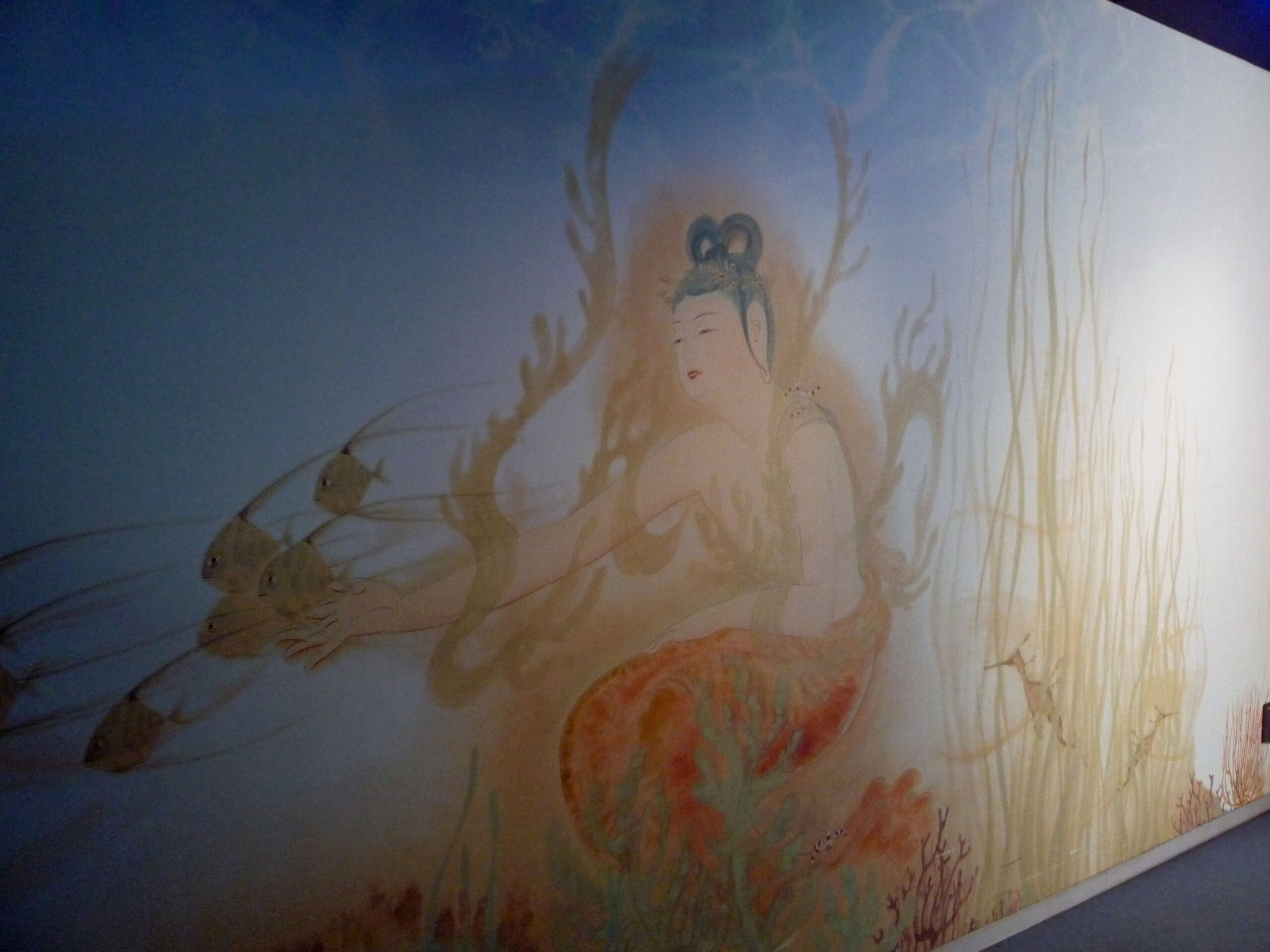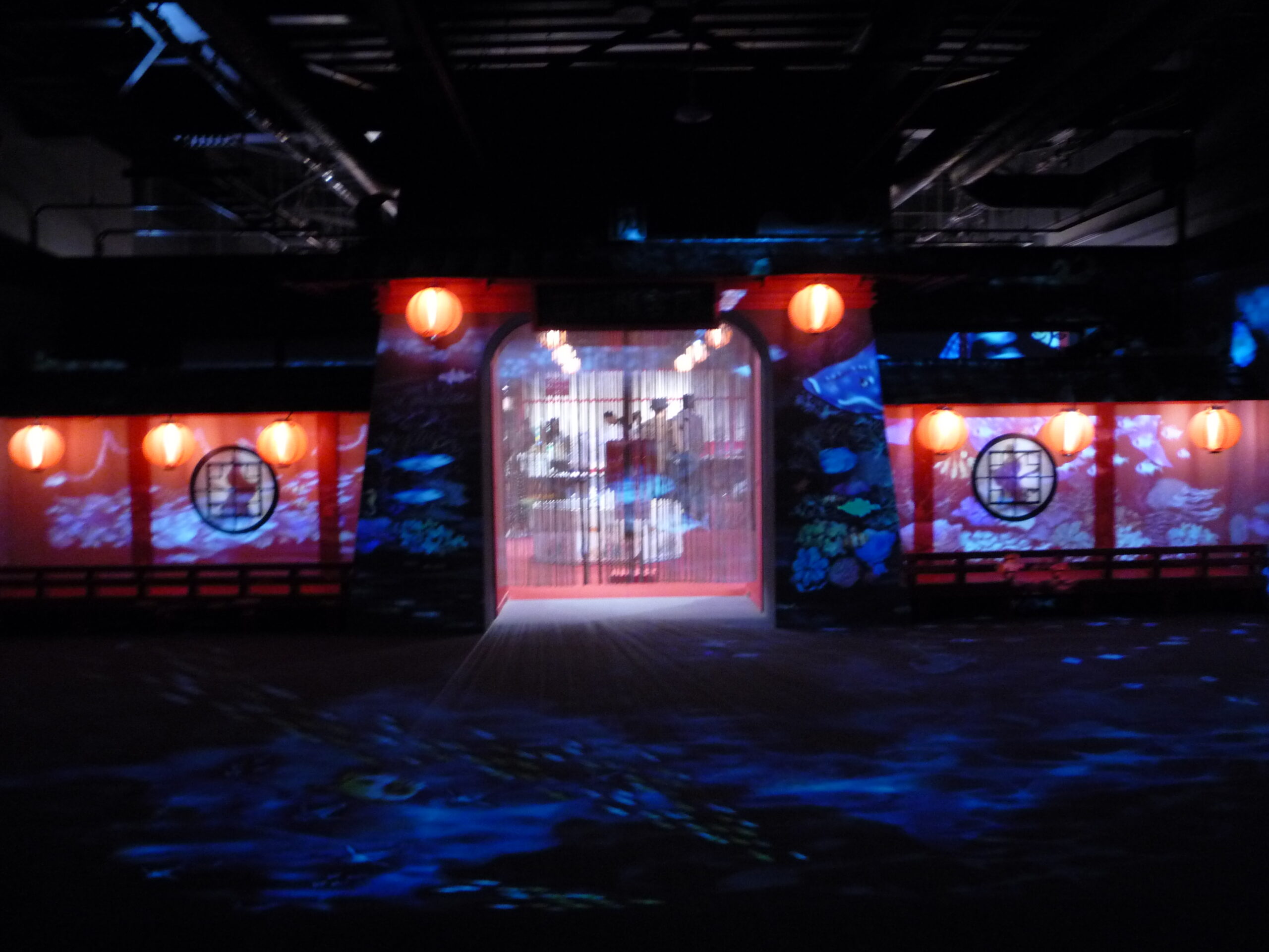 香川県三豊市には「浦島太郎伝説」が伝えられ、「竜宮の景」は、竜宮城に誘うような回廊に仏絵師さんの描かれた仏画や水中の世界が素敵でした。回廊の先の竜宮殿は、切り絵作家さんによる「切り絵」と「光」がコラボした華やかな中にも神秘的な龍宮の水中世界が表現されていました。他の水族館にはない芸術的な演出です。