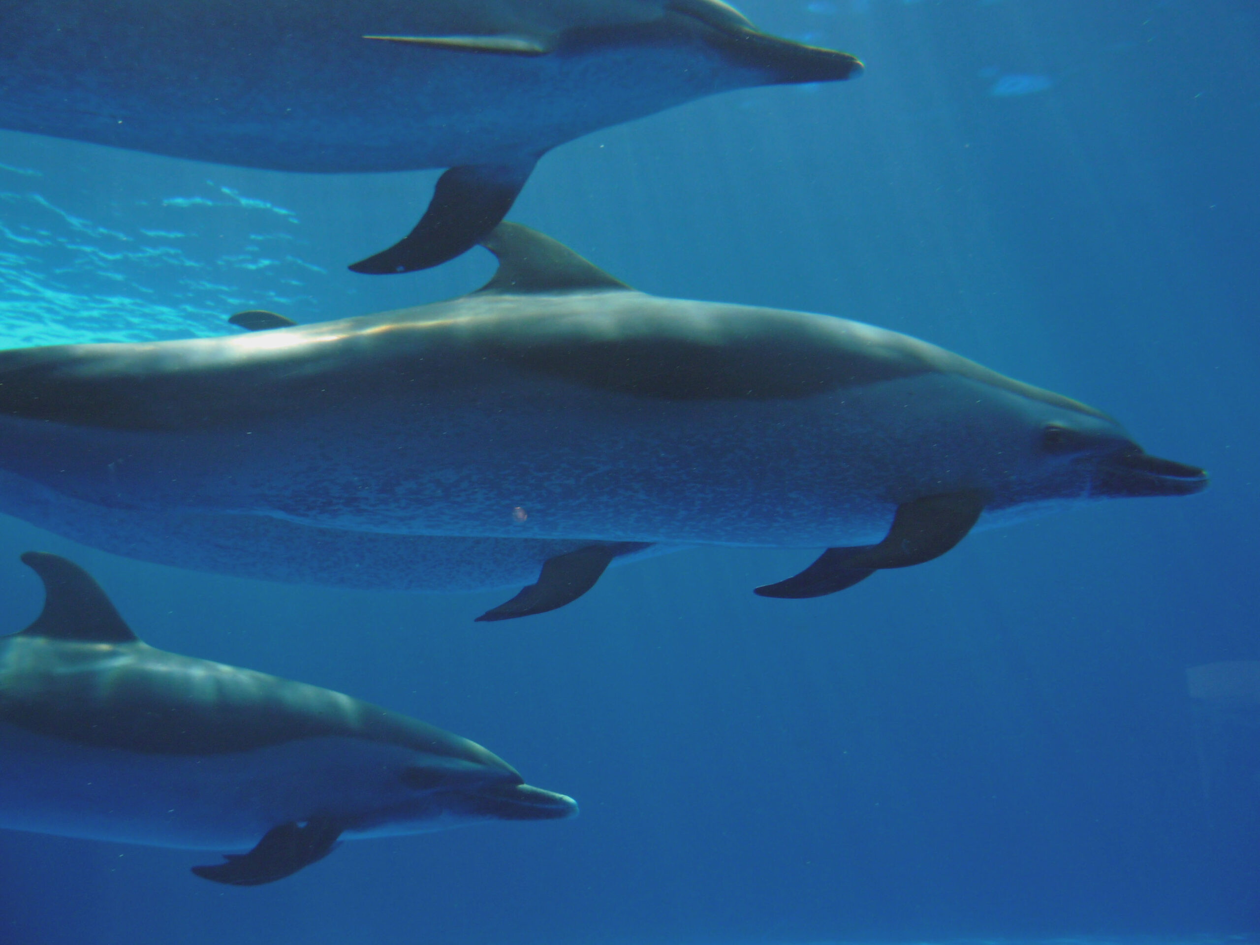 1階に降りると海豚ホールがあり、イルカプールの水槽の底です。ショーの最中、この水槽から上を見上げて楽しむのも面白そうですね。ジャンプ前の瞬間的なイルカの水中での動きや、尾びれだけで立ち泳ぎをする時の水中の姿は中々見られませんものね。