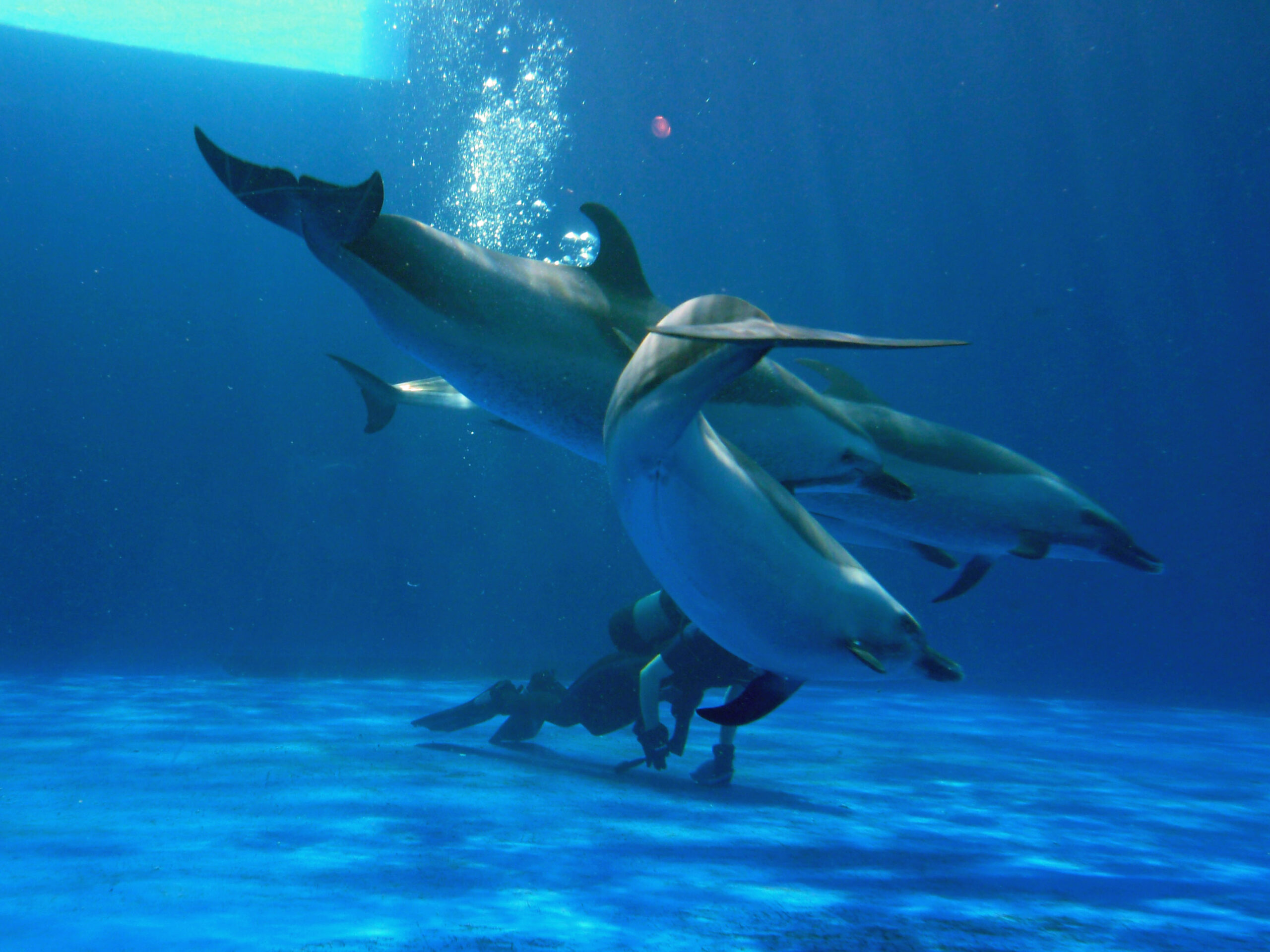 ダイバーがプールの底の掃除を始めると回遊していたイルカたちが、いっせいに擦り寄っています。こんなになついてくれると可愛いですね。