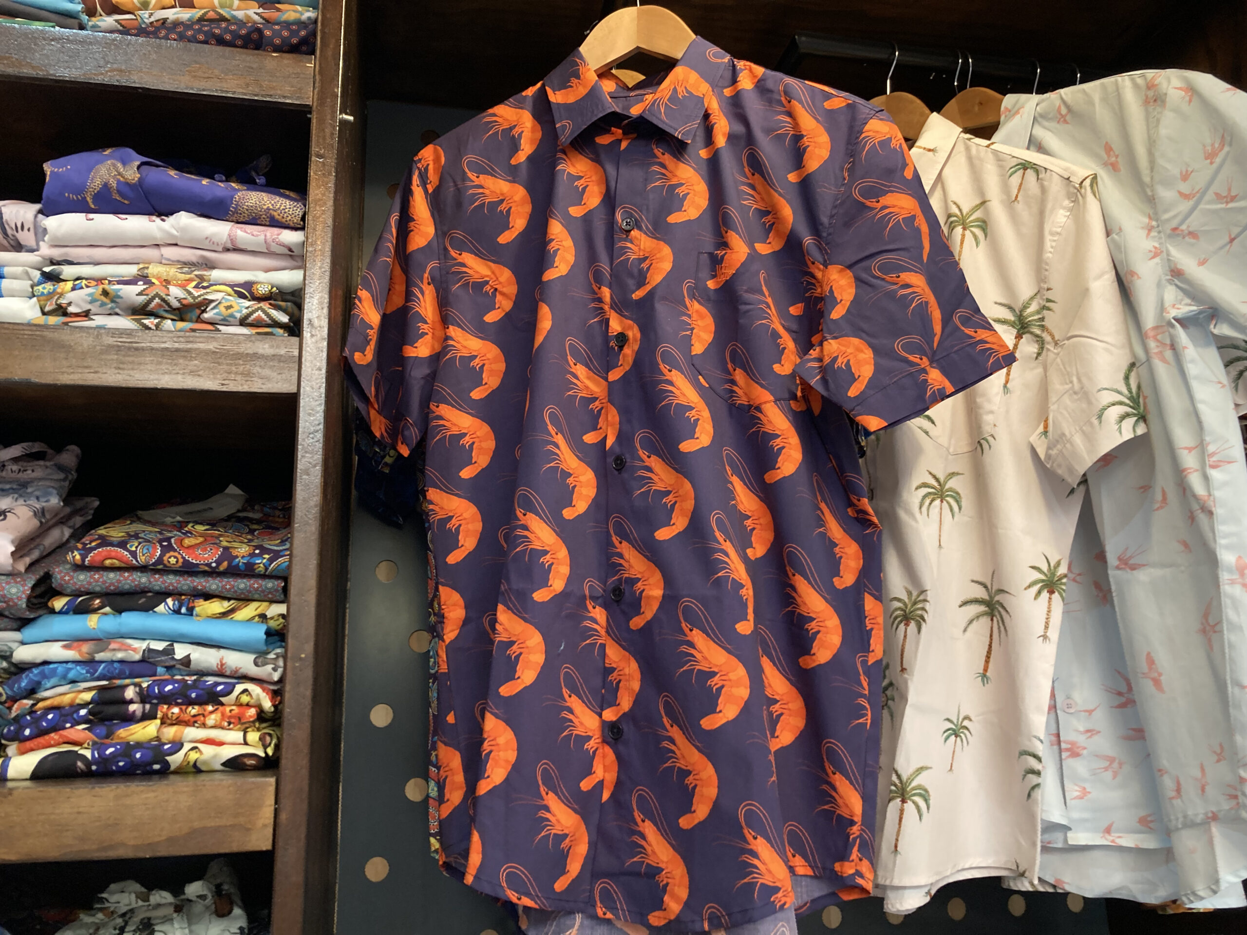 リアルなエビ柄のシャツとペンギンのトートバックを発見しました。