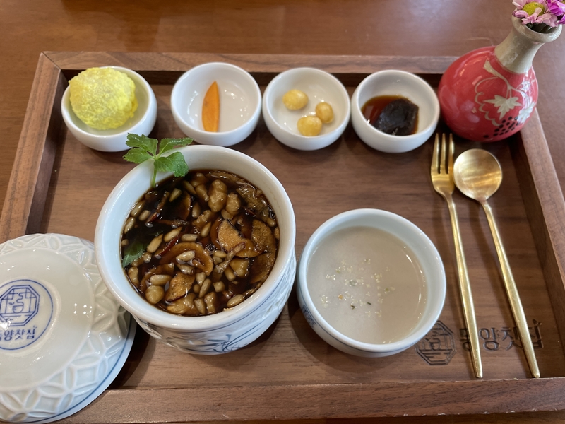 こちらのお店の看板メニューは伝統双和茶(ジョントンサンファチャ・전통쌍화차)で生姜やナツメ、シナモンなどが入っているお茶です。濃い味、柔らかい味のどちらか選べます。お菓子付きのセットで7000ウォンです。お菓子は写真左から、お餅、柿のドライフルーツ、銀杏スナック、紅参のお菓子です。双和茶の右にあるのは山芋のお粥でとろりと食べやすかったです。