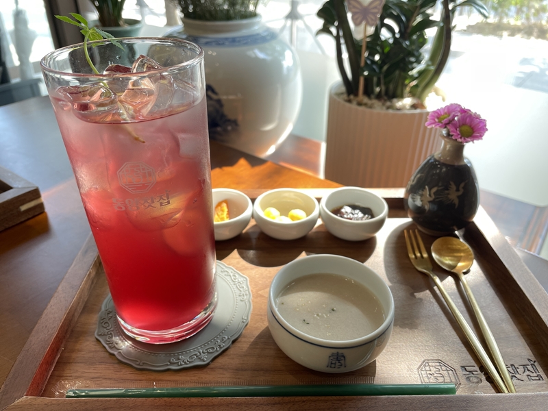 こちらはアイス五味子茶です。五味子(オミジャ・오미자)は甘味、酸味、苦味、辛味、塩味の五つの味がするという赤い果実です。その五味子を煎じた水に蜂蜜や砂糖を入れたものが五味子茶(オミジャチャ・오미자차)です。味は甘酸っぱく、爽やかな味で、夏バテによさそうです。こちらは6000ウォンです。どちらもリーズナブルな価格でお茶とお菓子が楽しめます。