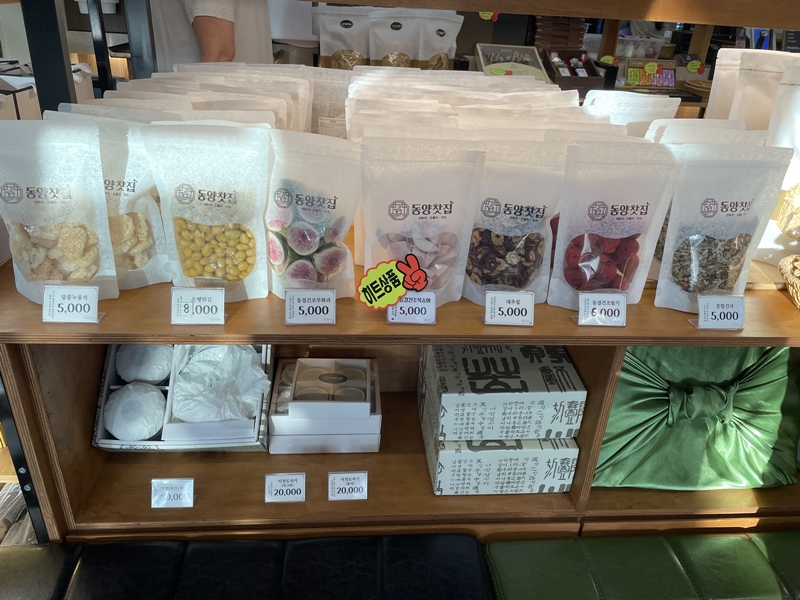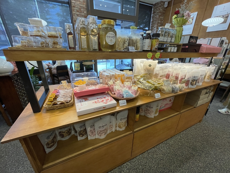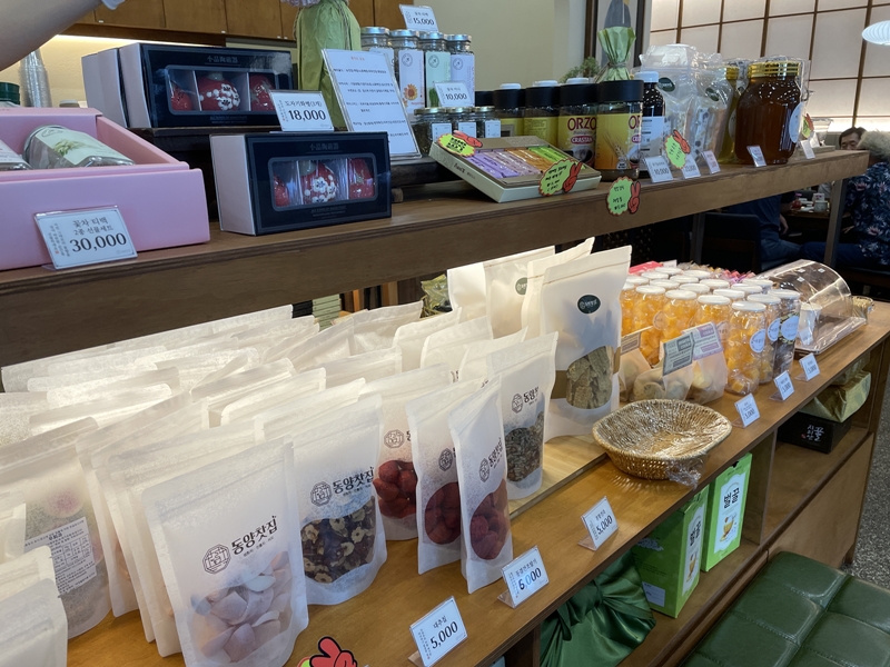 店内には薬菓(ヤックァ・약과)という伝統菓子やドライフルーツ、伝統茶、フラワーティーなどが販売されています。お茶を楽しんだ後、ゆっくりお買い物もいいですね。