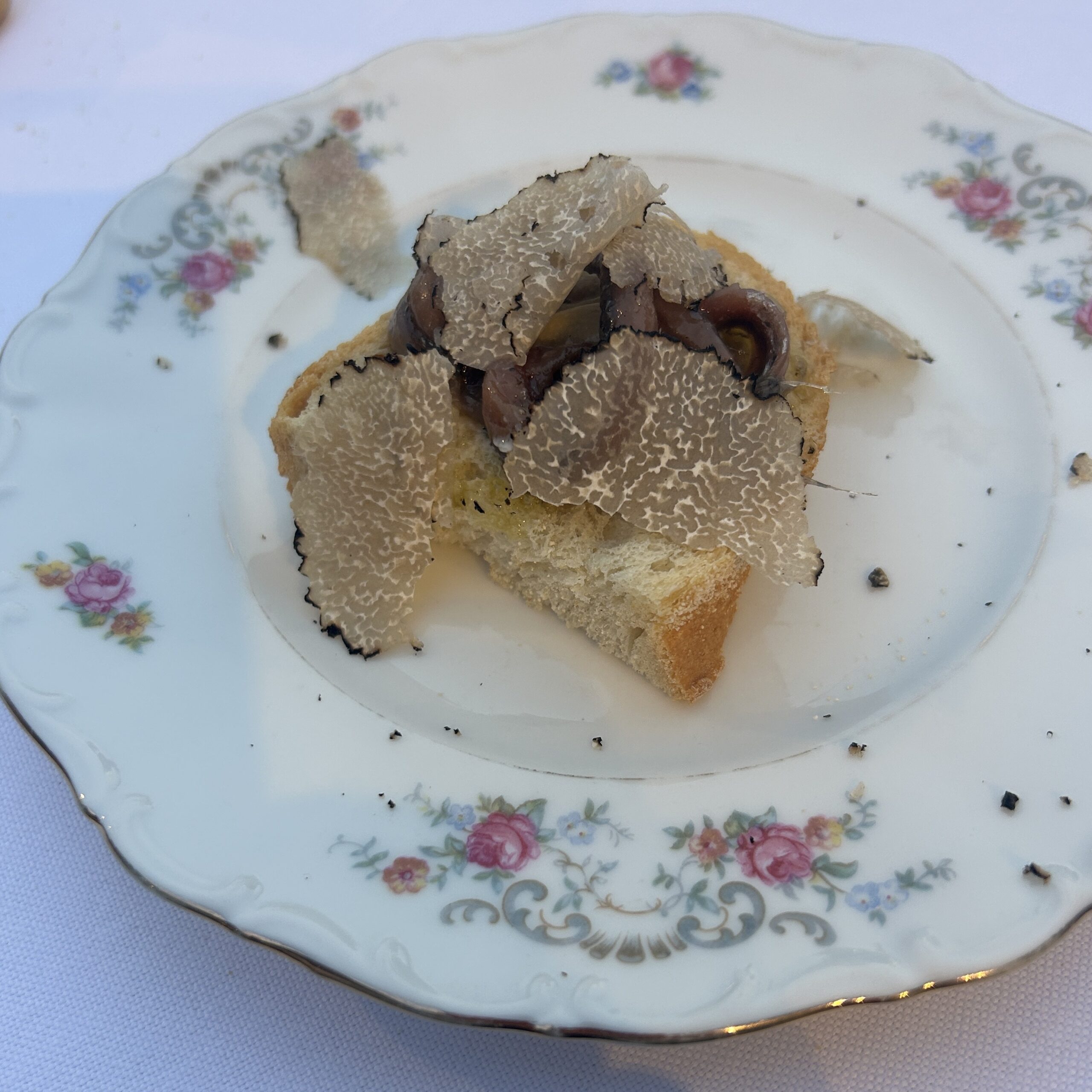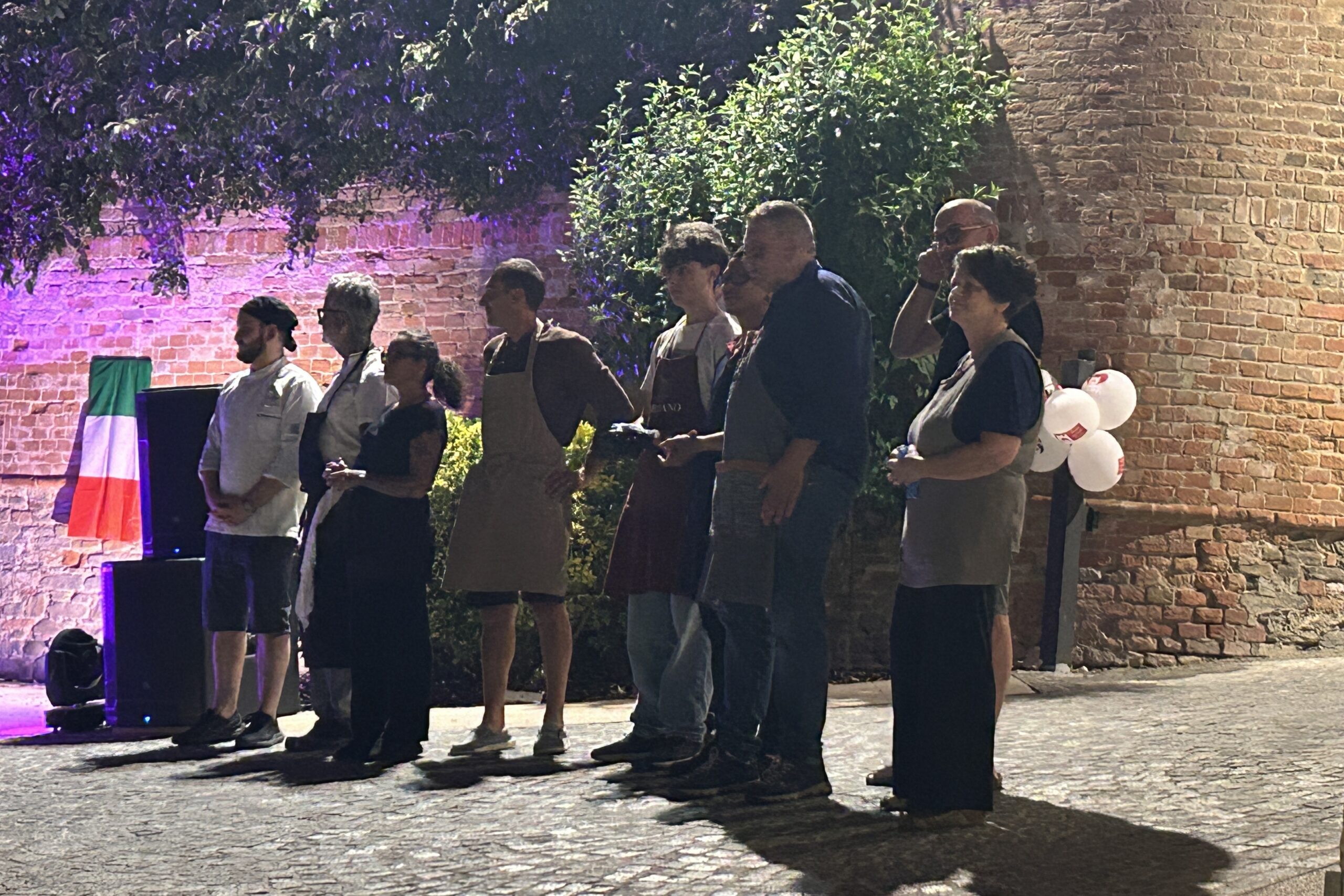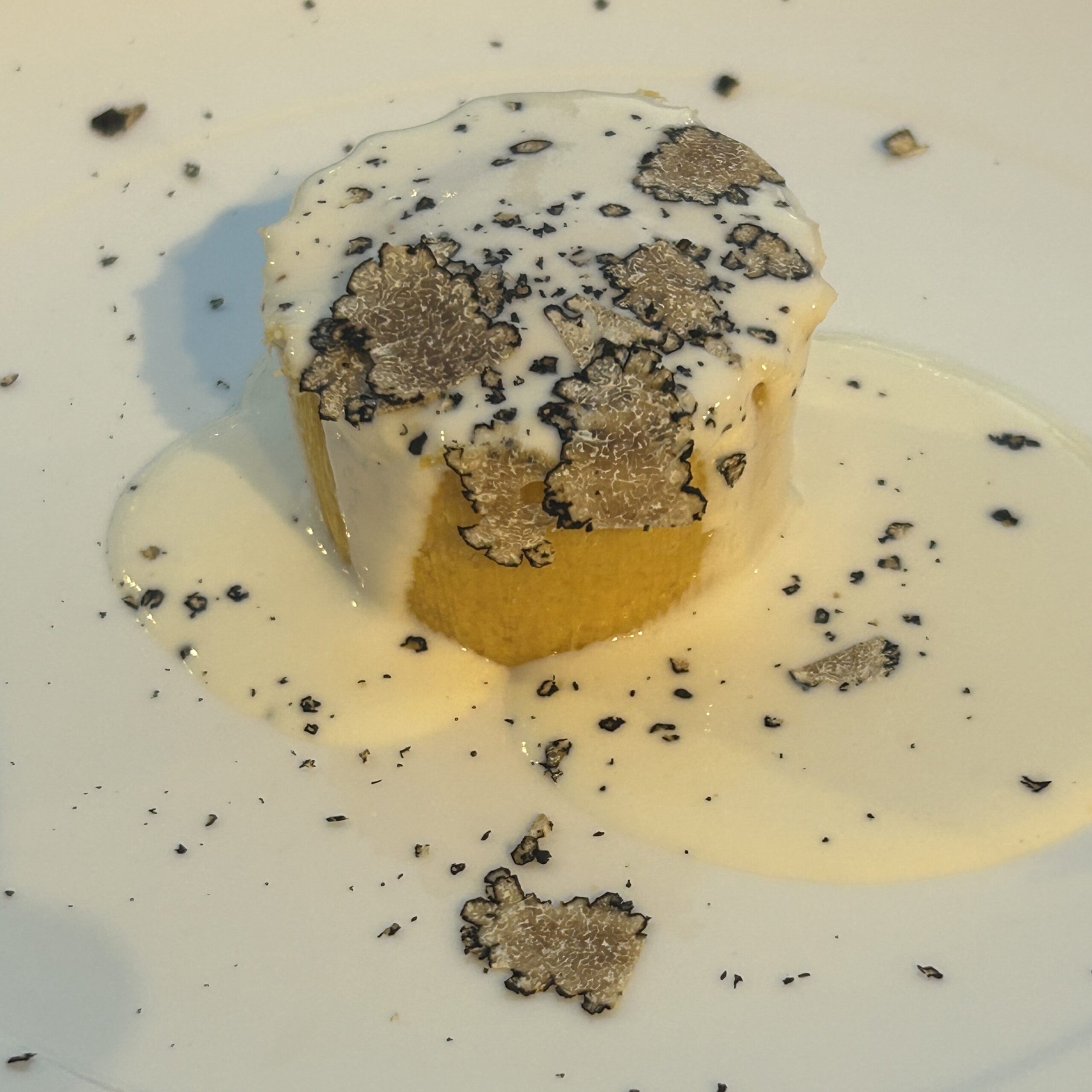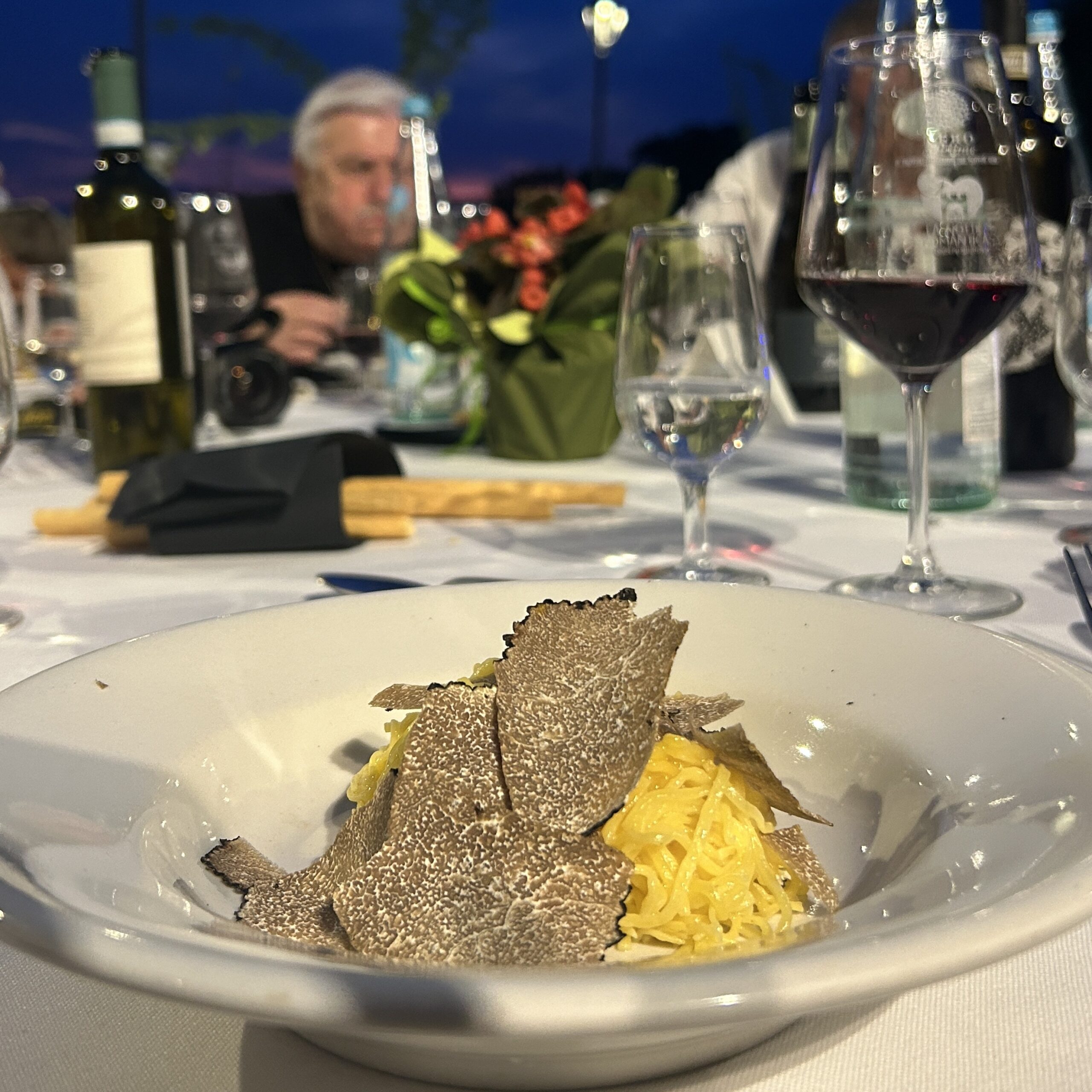 そんな2025年、注目の的となった黒トリュフを使ったディナーの様子です。北イタリアでも夜は、21時ごろまで明るいので、町の広場の中心地に特設テーブルが用意され、のりのりの市長さんも一緒にモンフェラート地方の観光にかける熱い想いを目の当たりにし、ある意味、新鮮な食事会となりました、