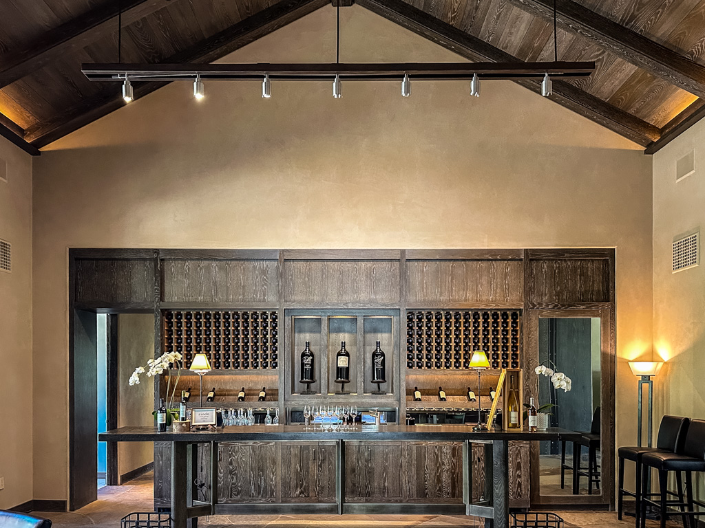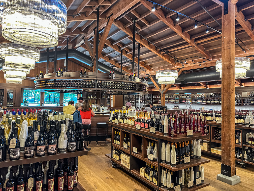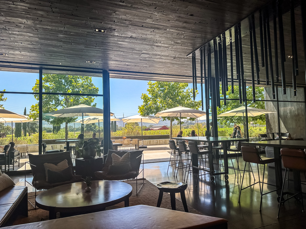 ランチだけの場合は、入り口で”Just having lunch“と言って入り、右手に続く小径を進むと新築なったテイスティングルームがみえてきます。まだ建物前の噴水および入口ドアは工事中でしたが中はすっかり完成していました。入口左がデリ、正面がショップ、奥がテイスティングカウンターです。