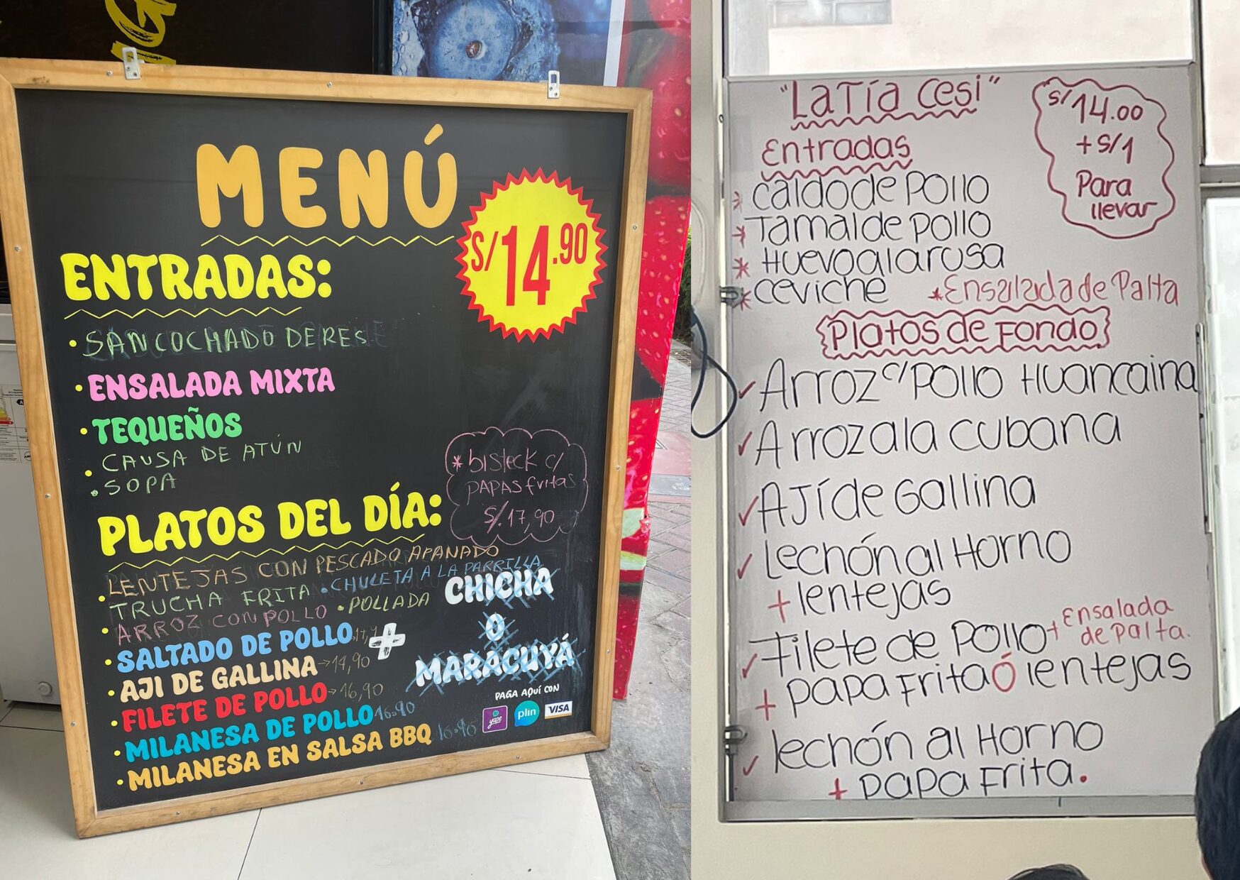 私自身も、ペルーに来たばかりの頃は地元ペルー人に教えてもらうまでその存在を知りませんでした。それがペルーのランチ定食「メヌー(Menú)」です!
