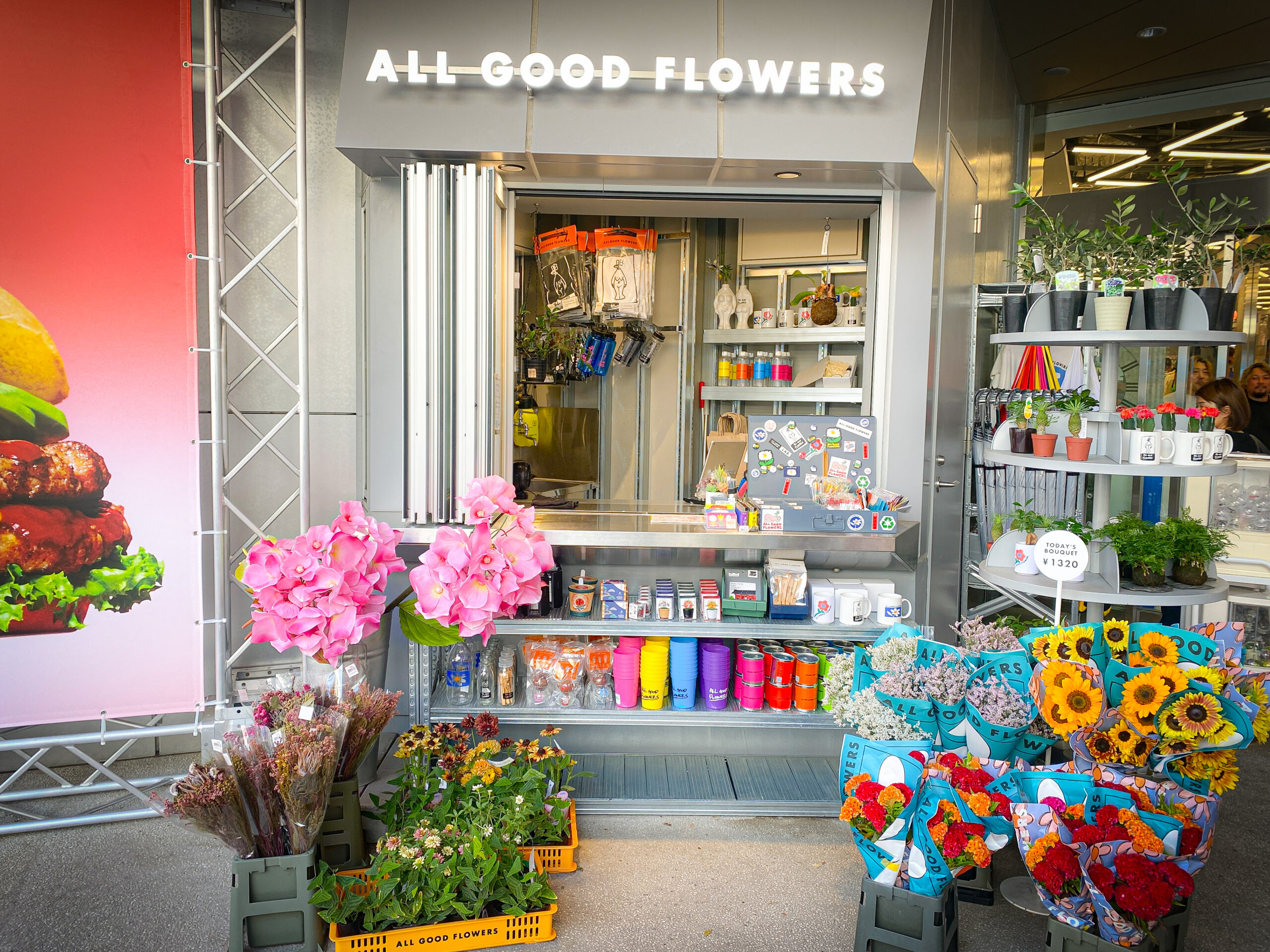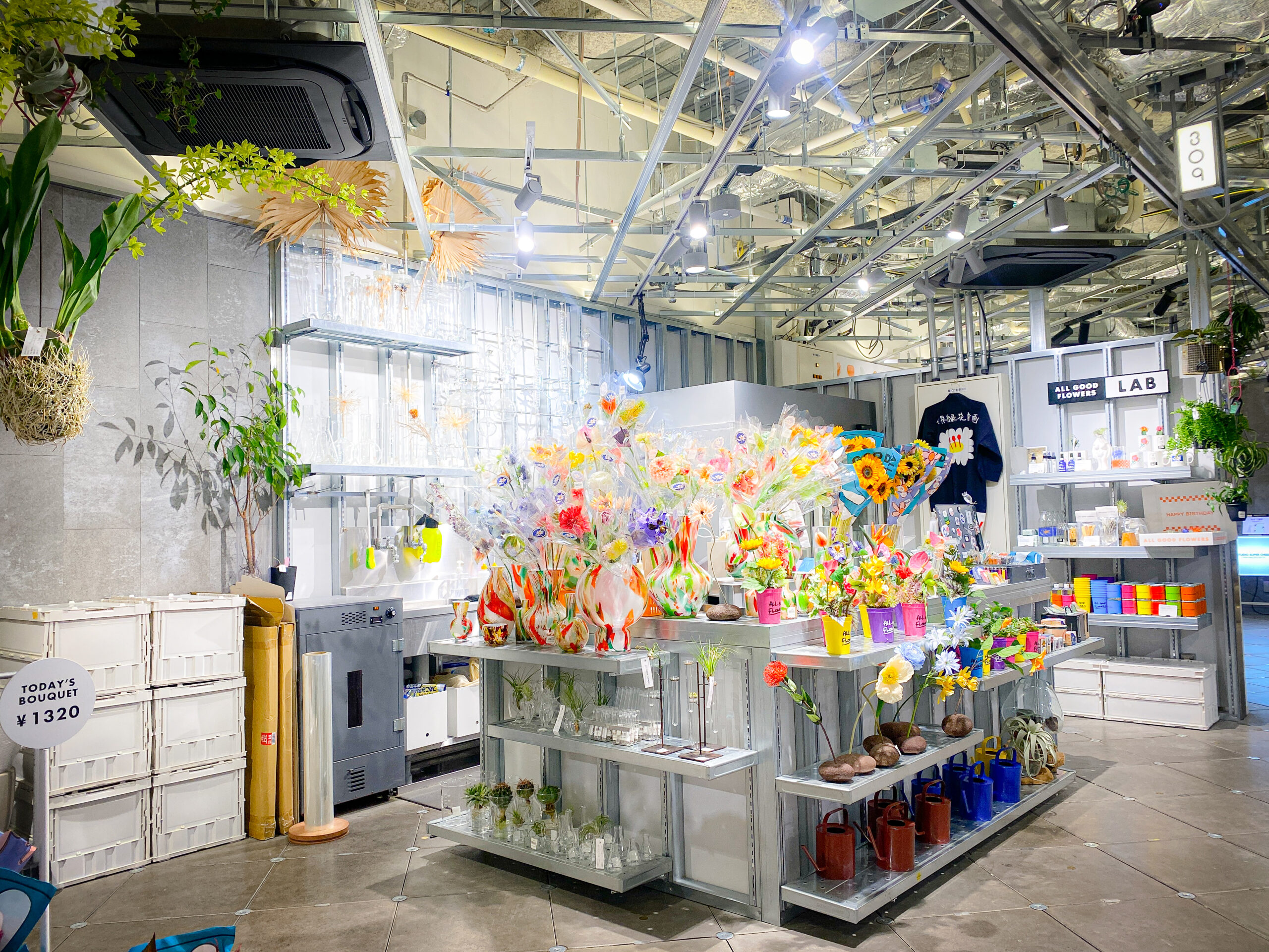 ハラカドの1階「ALL GOOD FLOWERS(オール グッド フラワーズ)」と3階「ALL GOOD FLOWERS LAB(オールグッドフラワーズラボラトリー)」に店舗を構える「ALL GOOD FLOWERS」。3 階はラボをイメージしており、生花や観葉植物だけでなく花器などの雑貨を揃えています。同店舗は、装飾などに使われて本来なら捨てられてしまうような花をドライフラワーなどに作り直し、新たな命を吹き込んでいるんです。