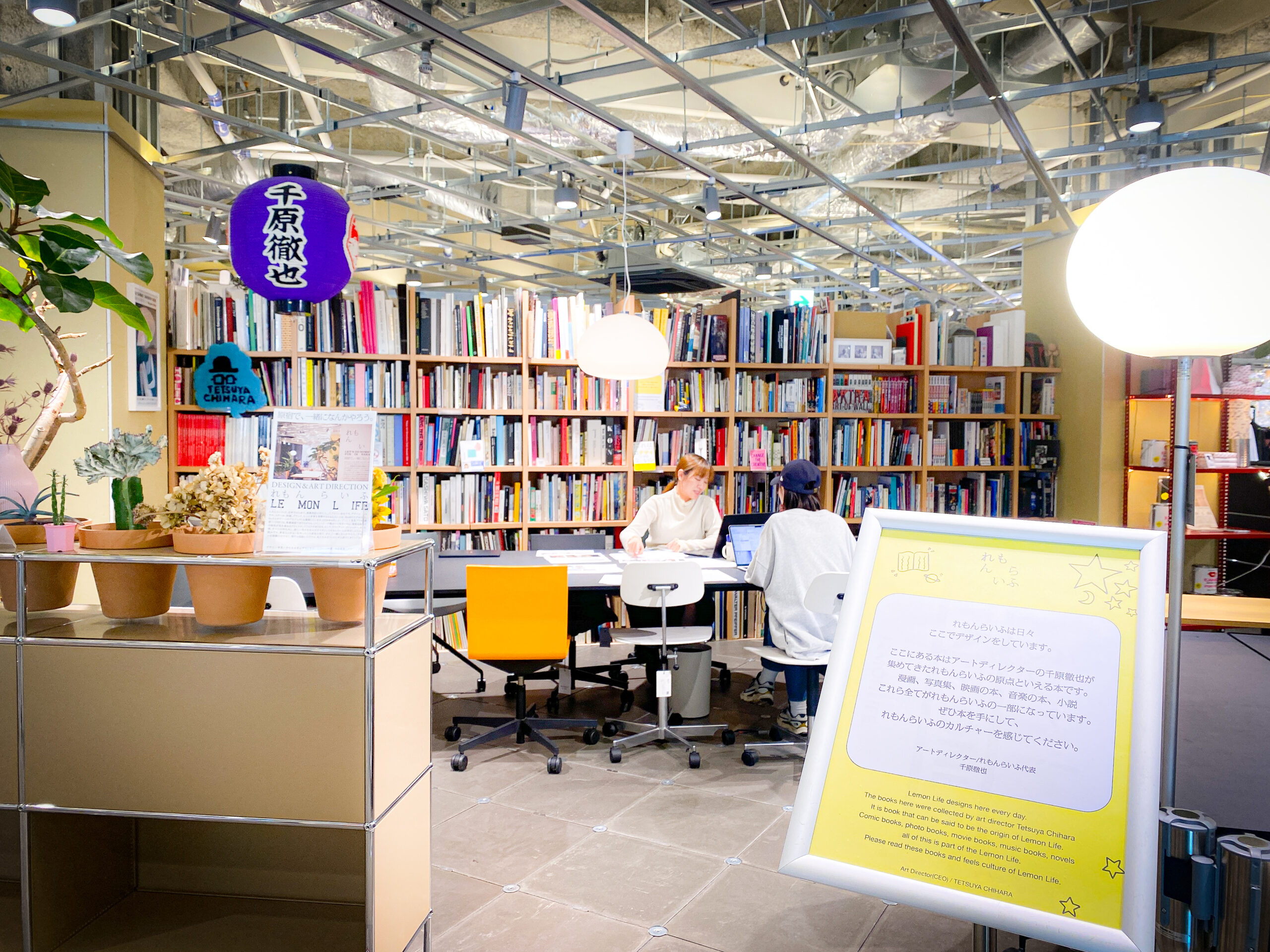 3階に事務所を構えるのはデザイン会社「れもんらいふ」。大きな本棚がある空間は、アートディレクターの千原徹也さんが集めた、「れもんらいふ」の原点ともいえる本がズラリと並んでいます。気軽に立ち寄れるのが嬉しい場所です。