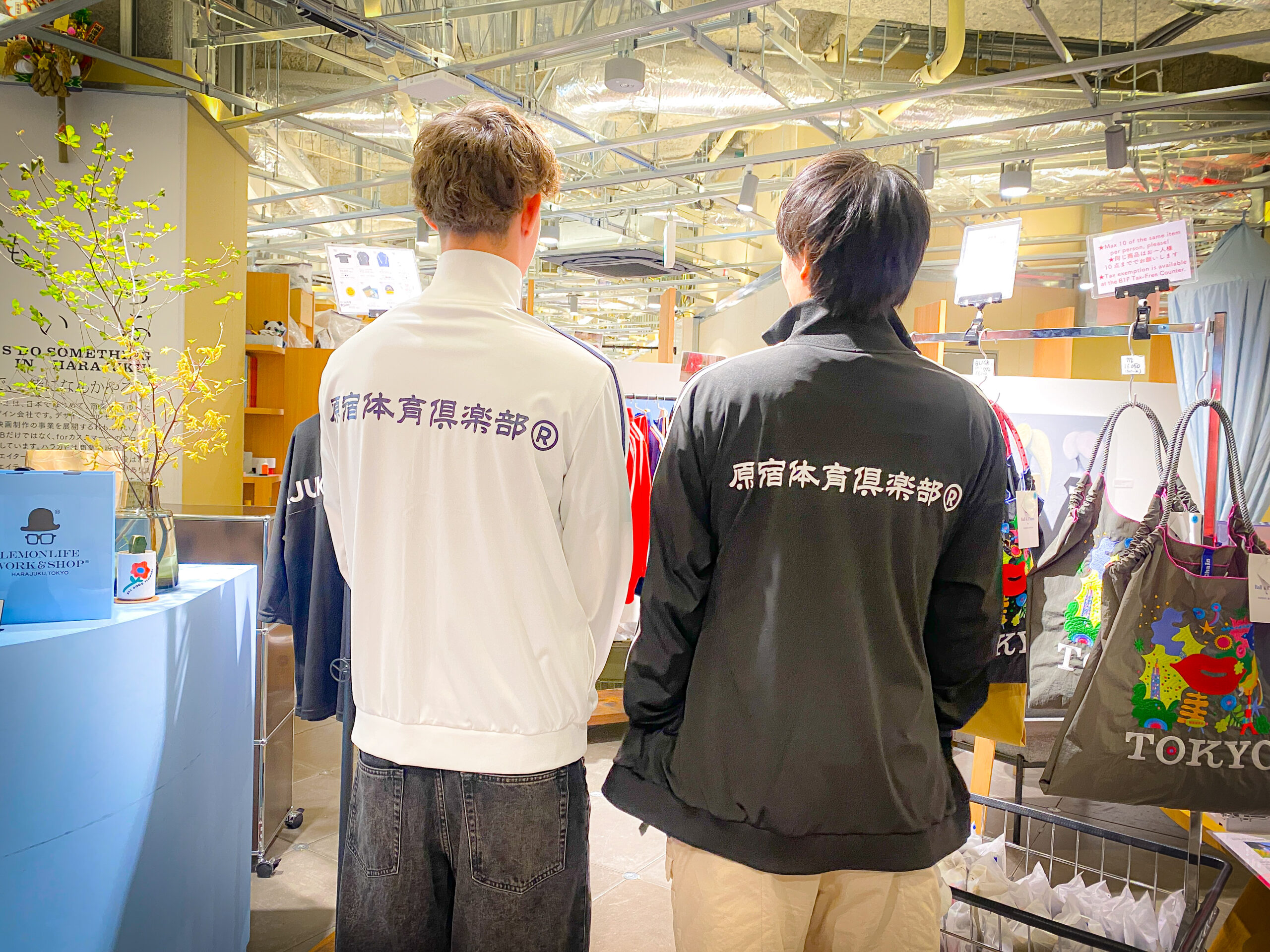 オフィスの一角には、「HARAJUKU SPORTS CLUB®(HSC®)」や「KISS, TOKYO(キストーキョー)」といったブランドが揃います。「HSC®」は、世界的にも稀なオリンピックが2度開催されたここ原宿から、スポーツが社会を明るくする力に賛同し動き始めたプロジェクト。Tシャツ、ジャージ、ソックス、大判バンダナ、キャップなどが並び、外国人観光客にも人気です。