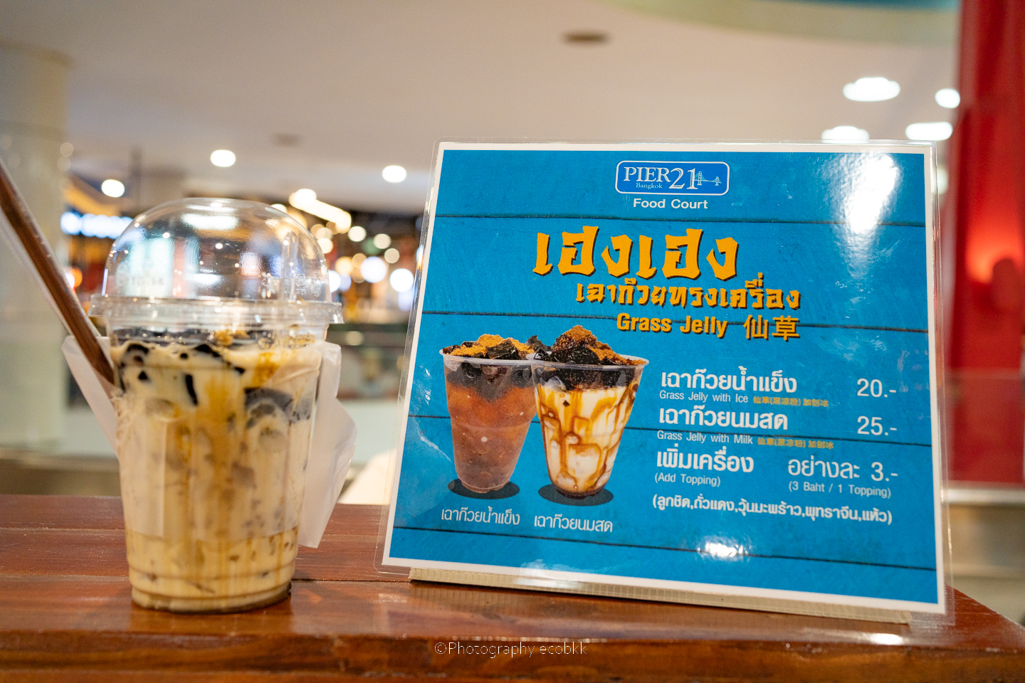 フードコートやタイ料理レストラン、タイスイーツ専門店等でも食べられます。タイの伝統的なスイーツであるからか、西欧等のスイーツに比べると、比較的リーズナブルな価格帯で飲食できること多いと思います。中でも、タイ王国バンコク都BTSアソーク駅直結のショッピングモール「Terminal21」アソーク店6階のフードコート「Pier21」はお得なお店が多く、チャオクワイ(仙草ゼリー)は氷入りが20バーツ、ミルク入が25バーツで、店頭にあるトッピングを3バーツ~追加できます。ミルク入しか頼んだことがありませんが、やや甘めですが、おいしいです。蓋を開けると、チャオクワイを食べやすいように、小さなスプーンも入っています。
