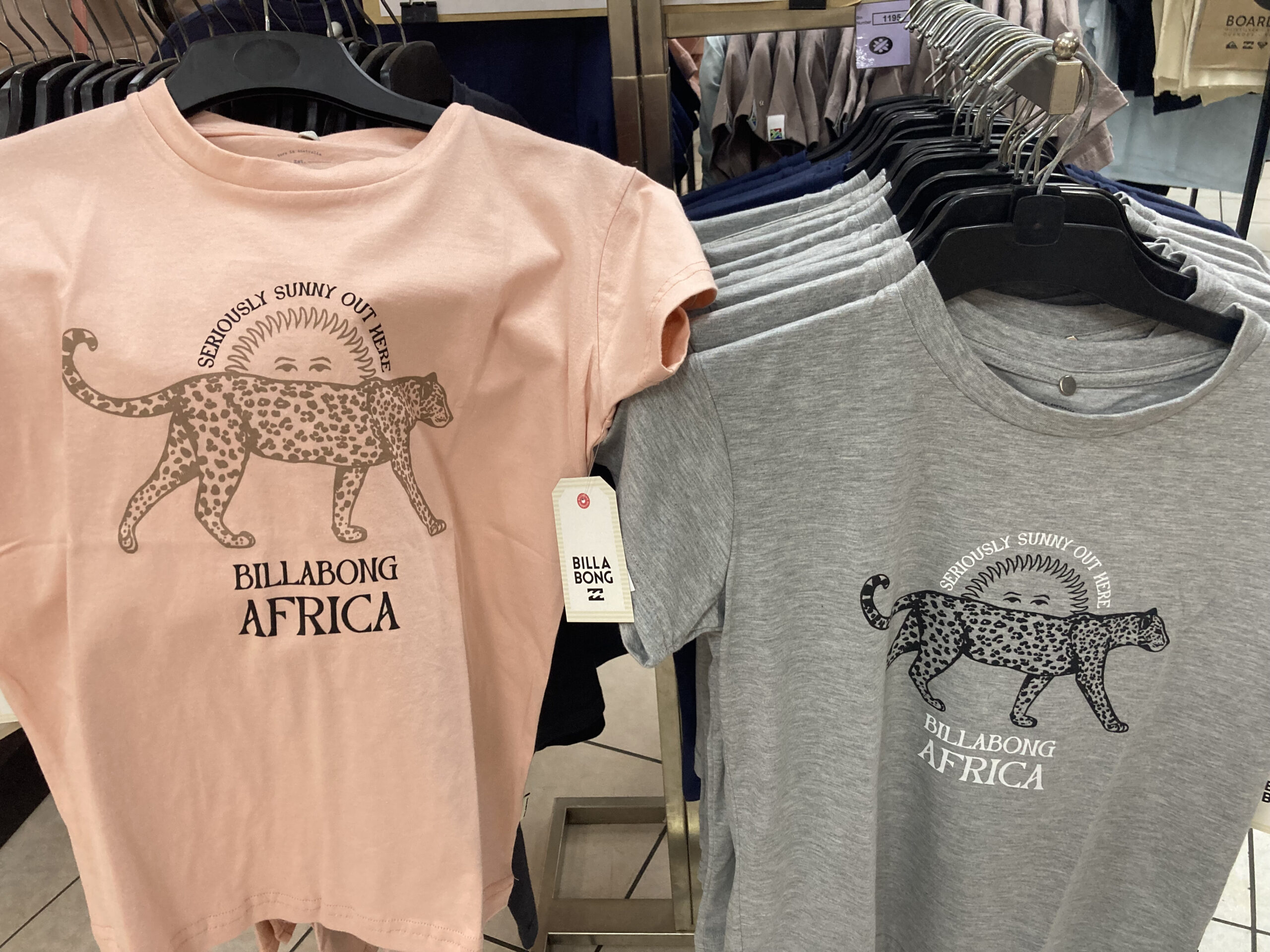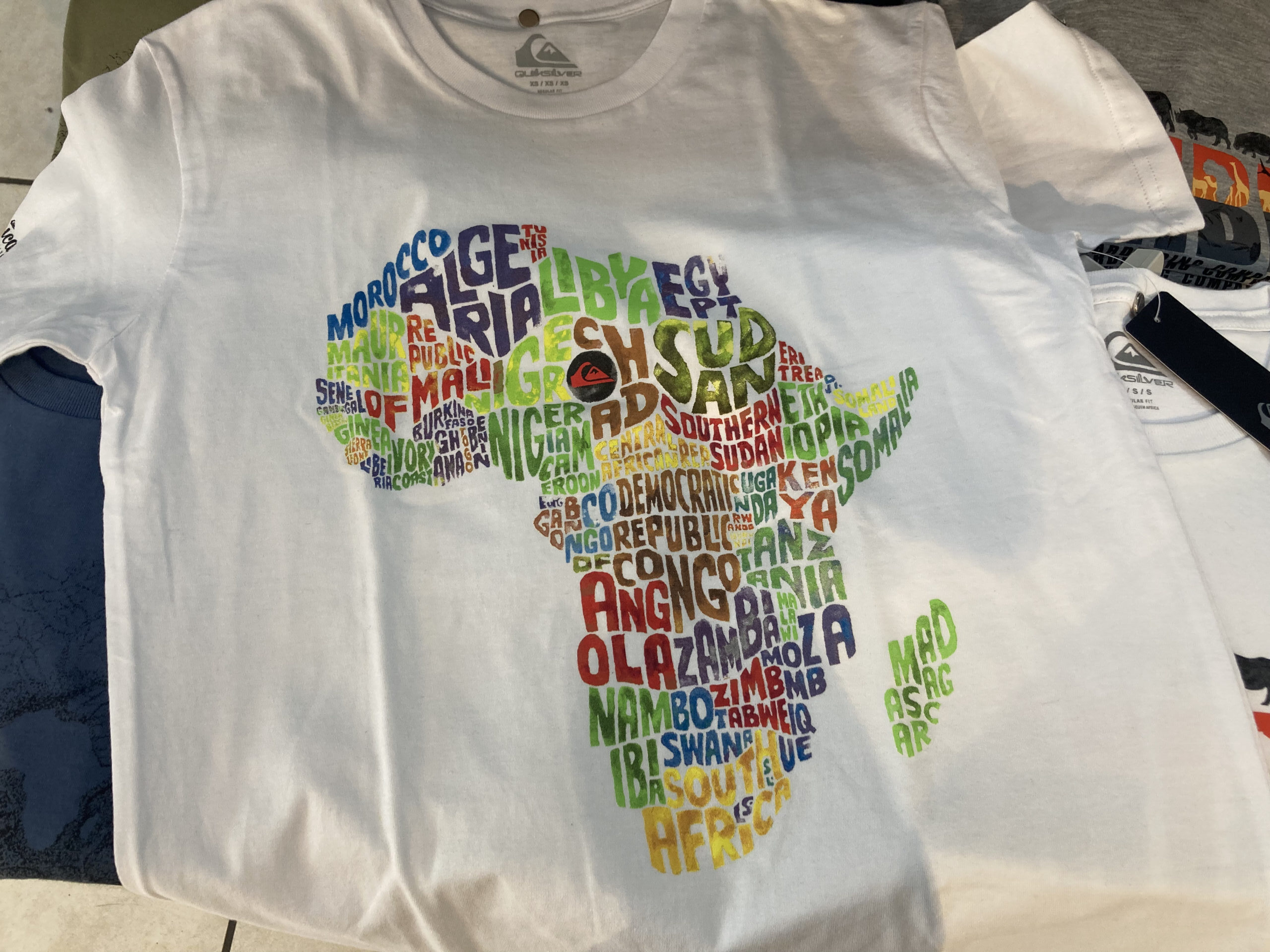 先ほど紹介したクイックシルバーは一目瞭然でアフリカとわかるデザインが多い一方、ビッグブルーのTシャツには南アフリカ人だけがわかる小ネタが詰まっています。