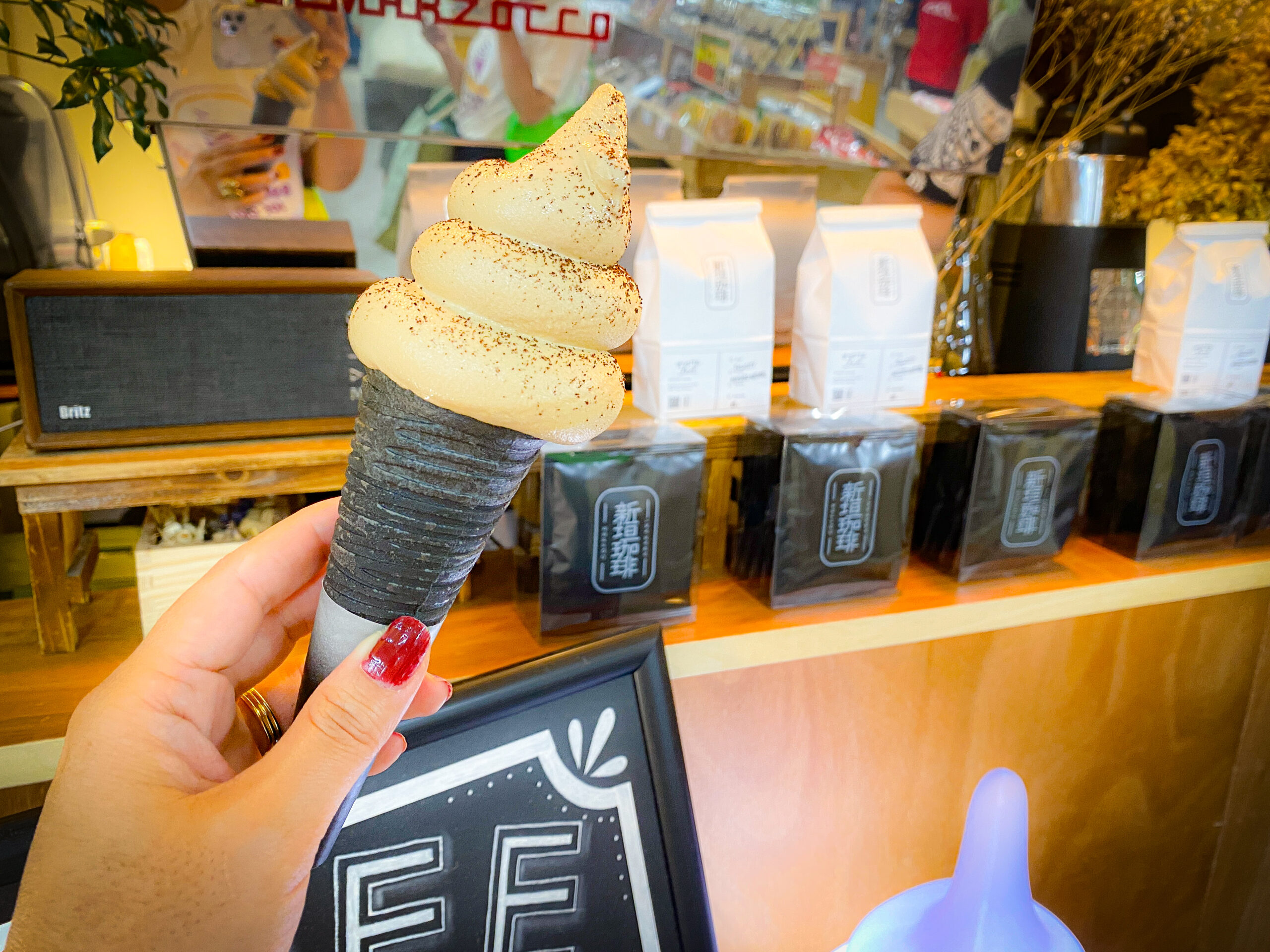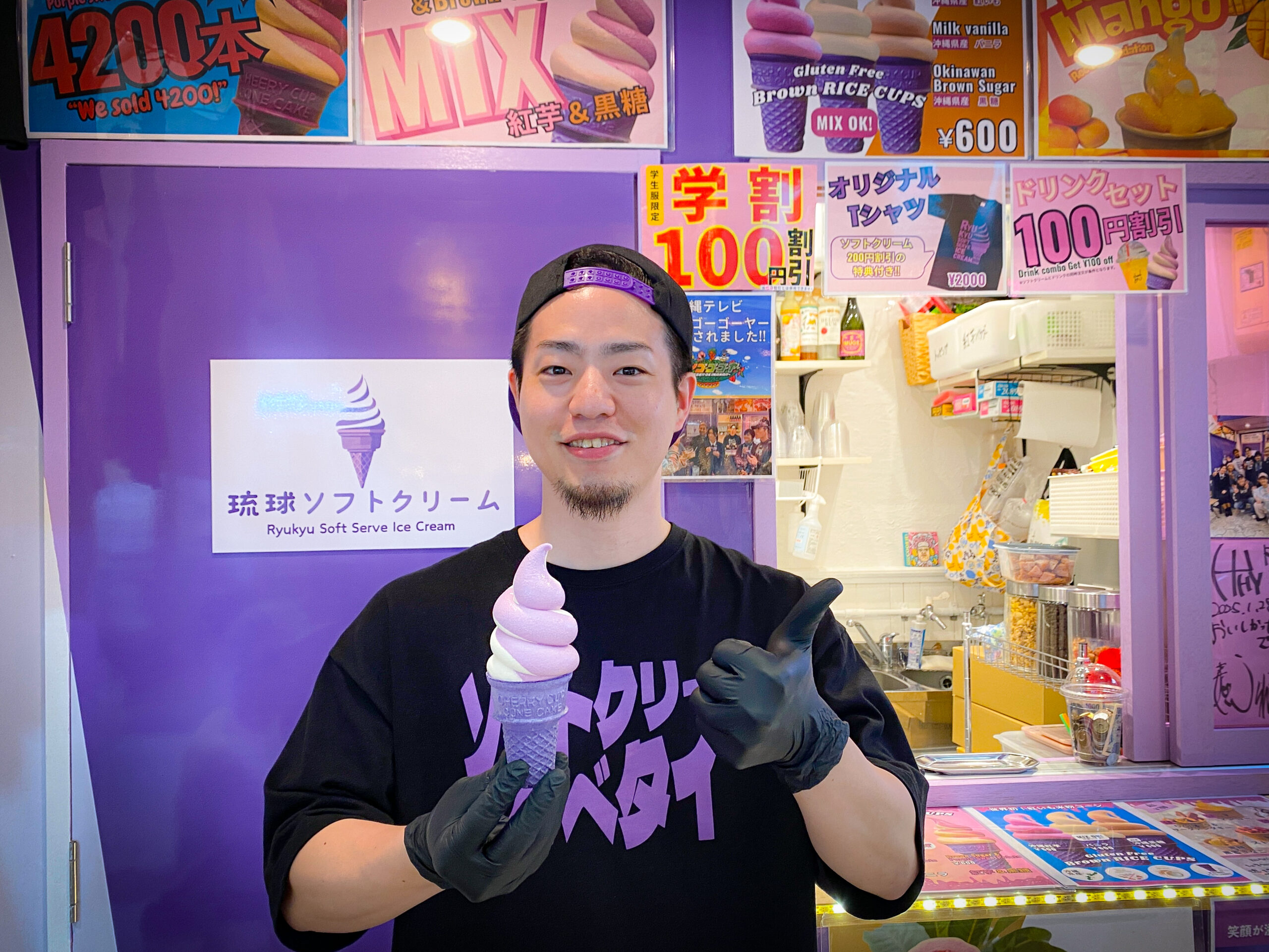 米粉を使用した、紅芋グルテンフリーコーンでいただくソフトクリーム。今回は、一番人気の「紅芋&黒糖ソフトクリーム」をいただきました。しっかりした紅芋の味わいと、黒糖とのバランスがちょうどいい。