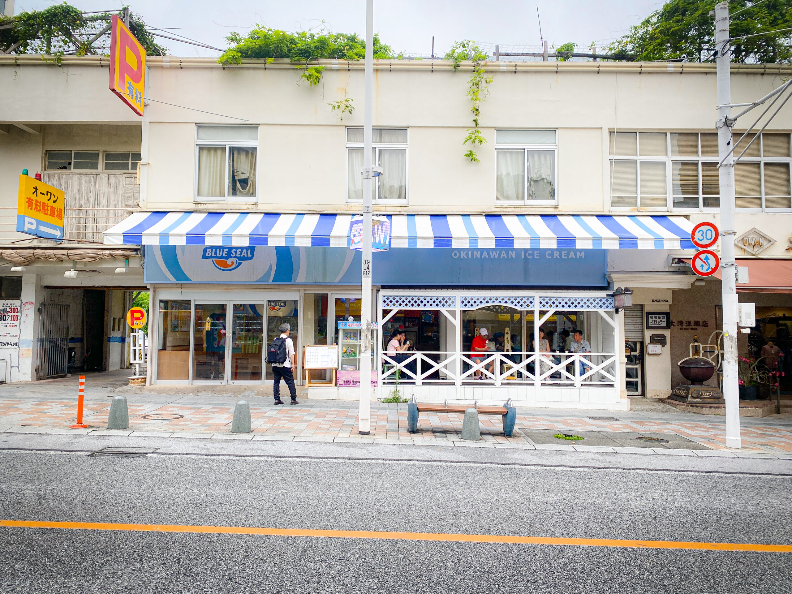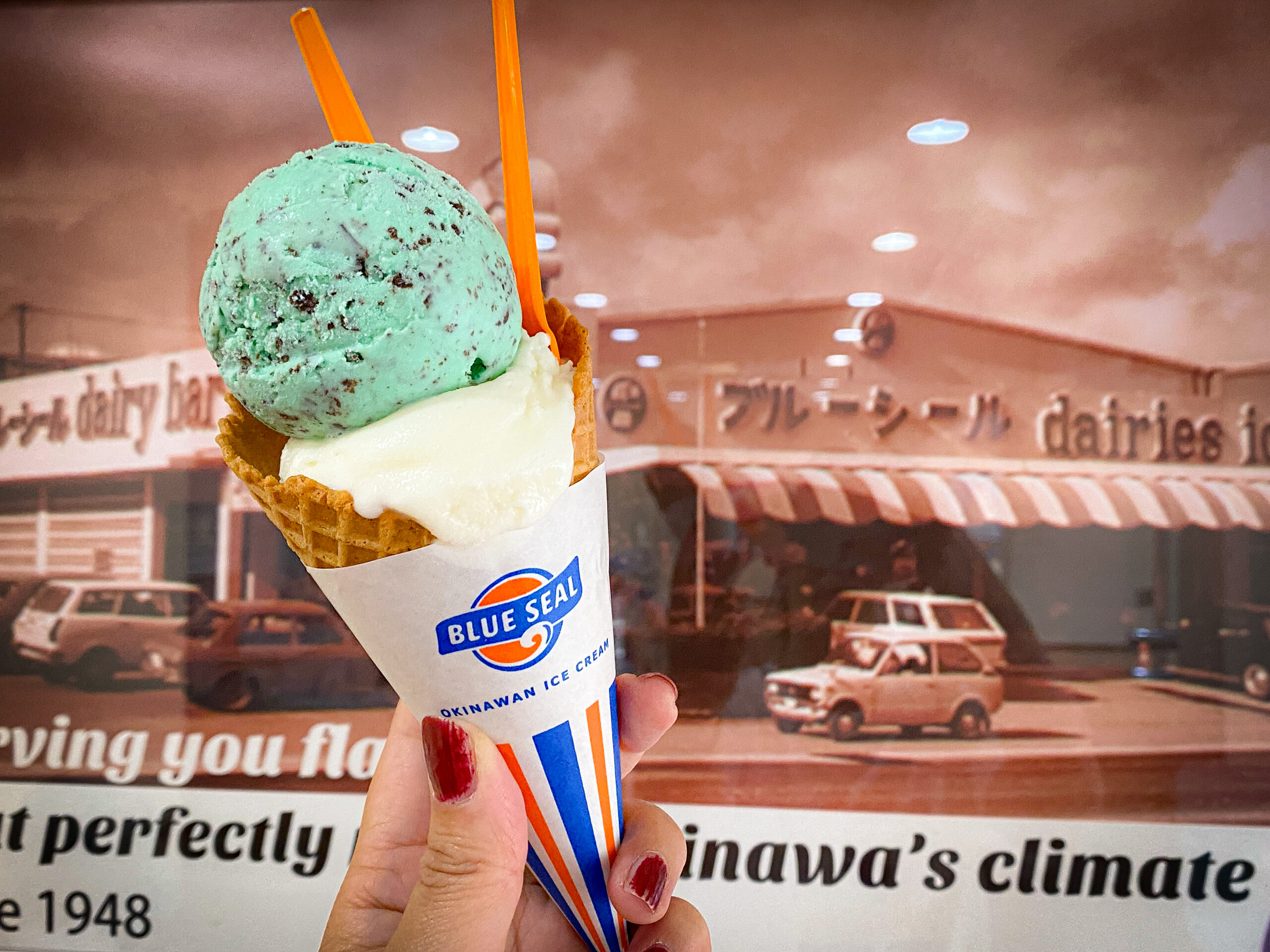 沖縄の王道アイスといえば、「ブルーシール」。アメリカ生まれ、沖縄育ちのアイスクリームブランドで、県内に約20店舗を構えています。今回は、サンフランシスコミントチョコとシークヮーサーシャーベットを注文しました。爽やかなミントの味わいと、酸味と清涼感のあるシークヮーサー相性抜群。一気に食べ進めてしまいます。
