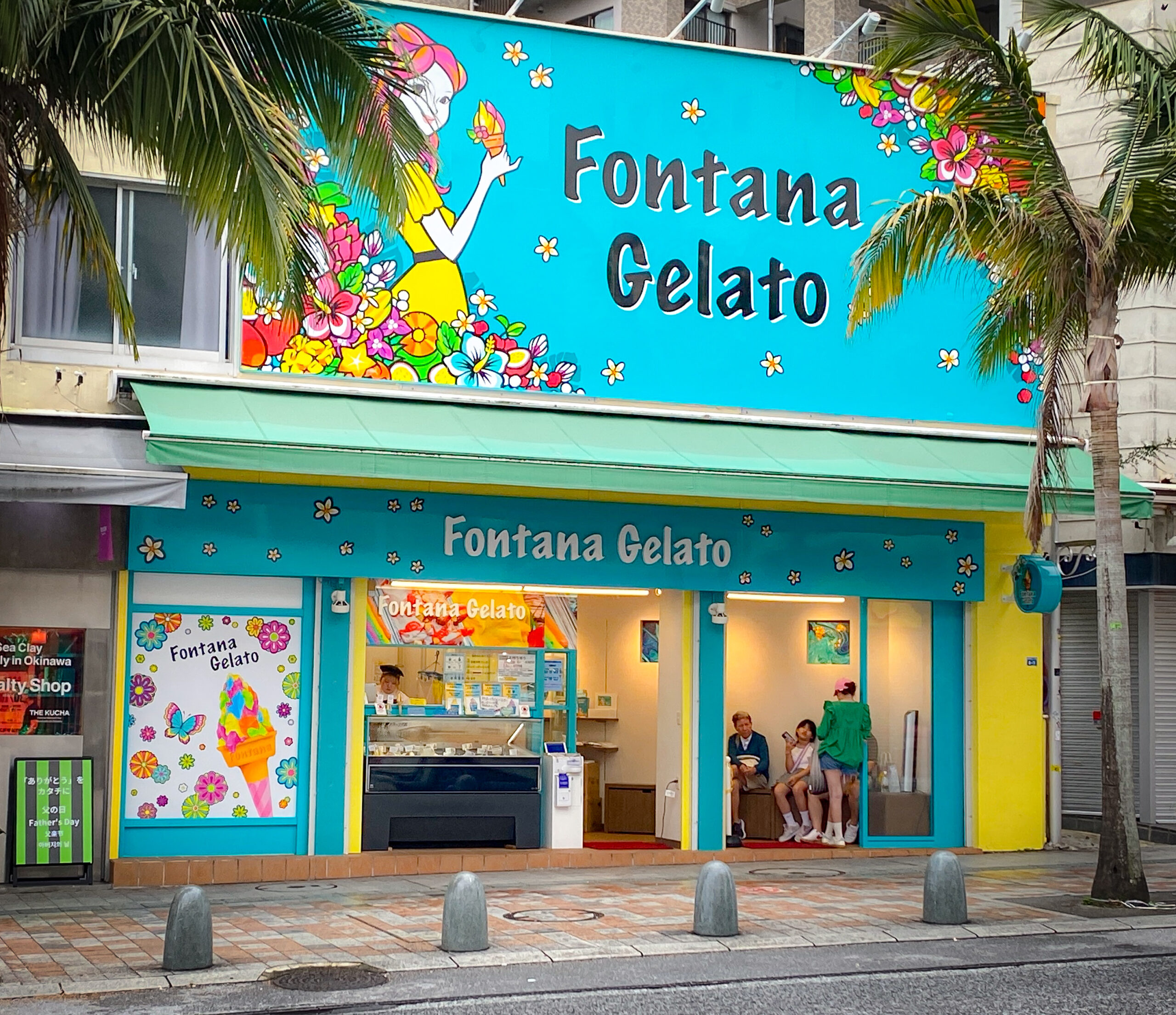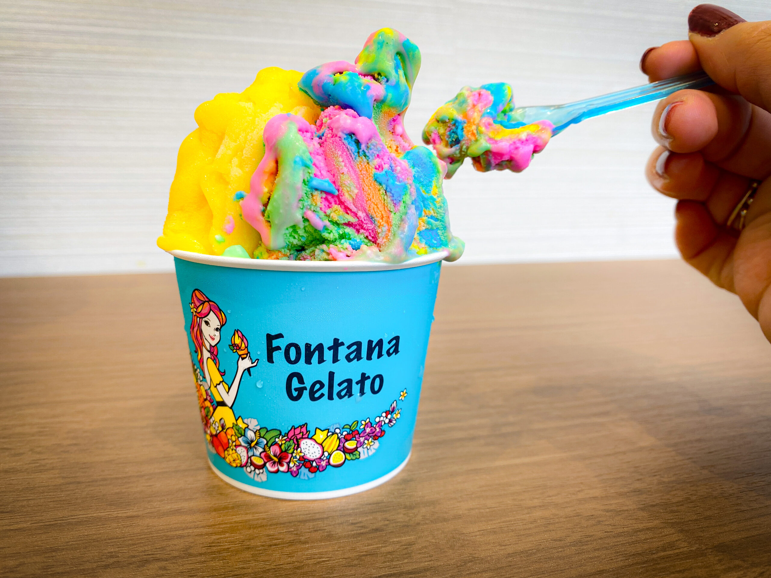 店舗もジェラートも、見た目が鮮やかで印象的な「Fontana Gelato」。人気NO1.のレインボーミルクとNO.2の県産完熟マンゴーをいただきました。
