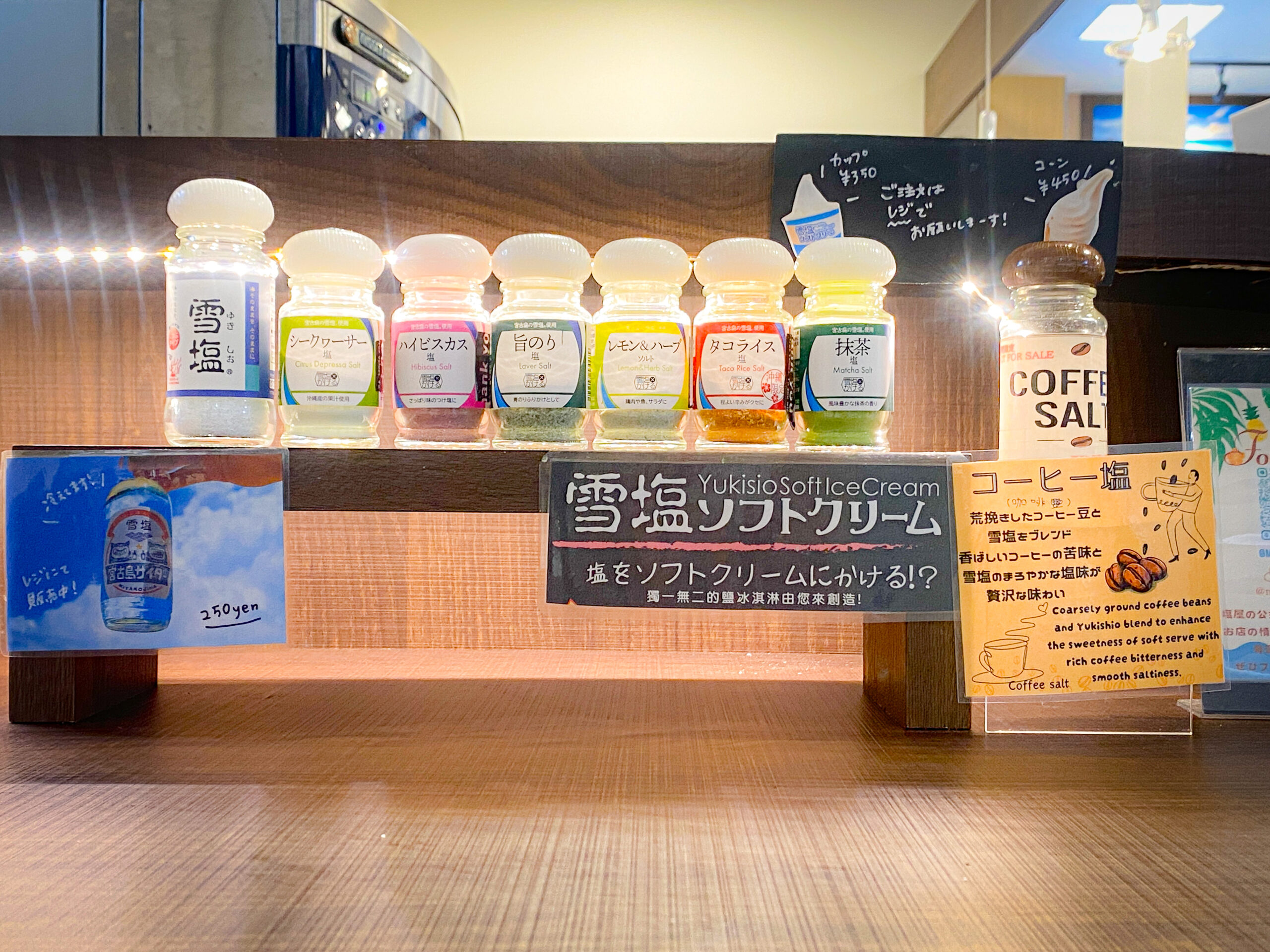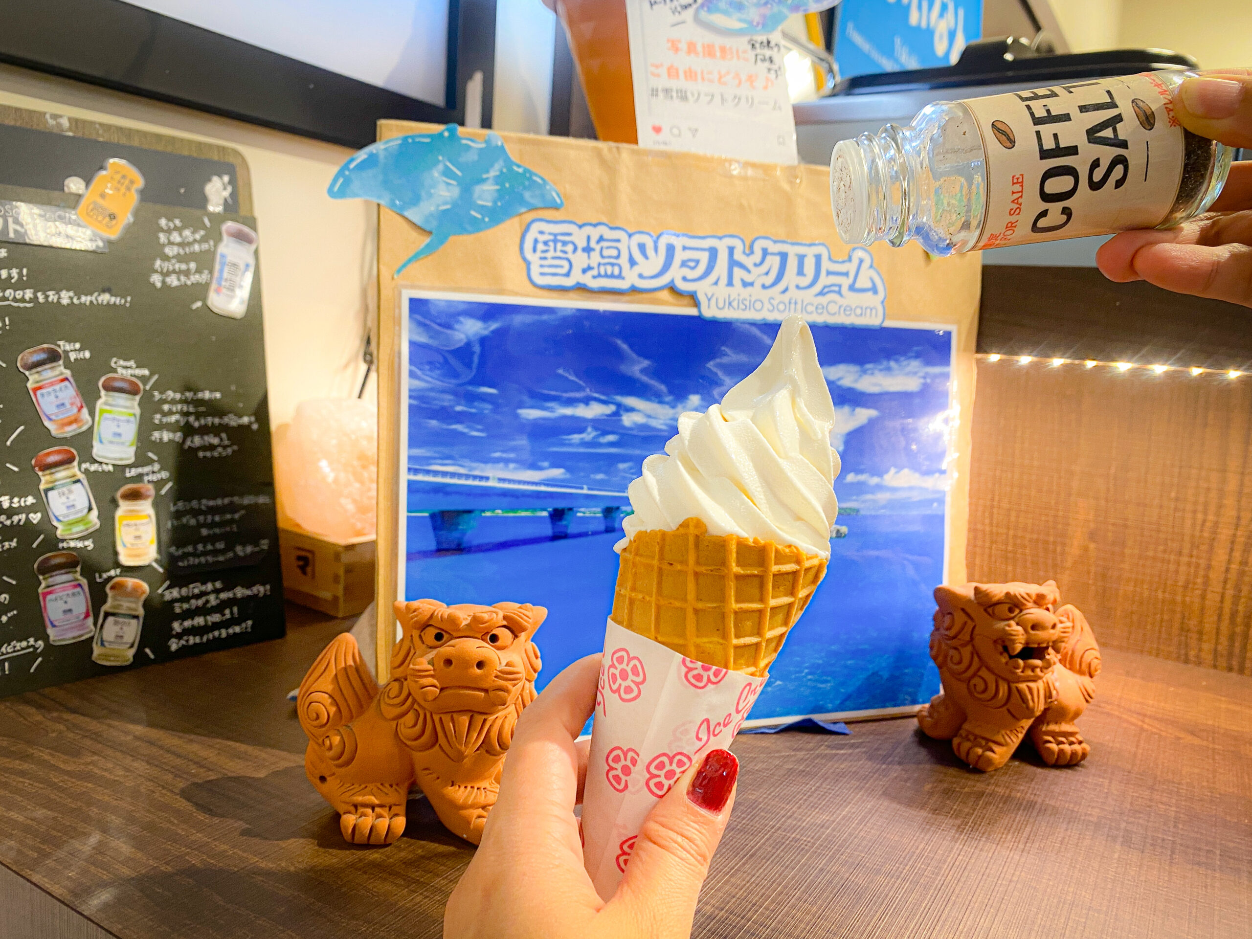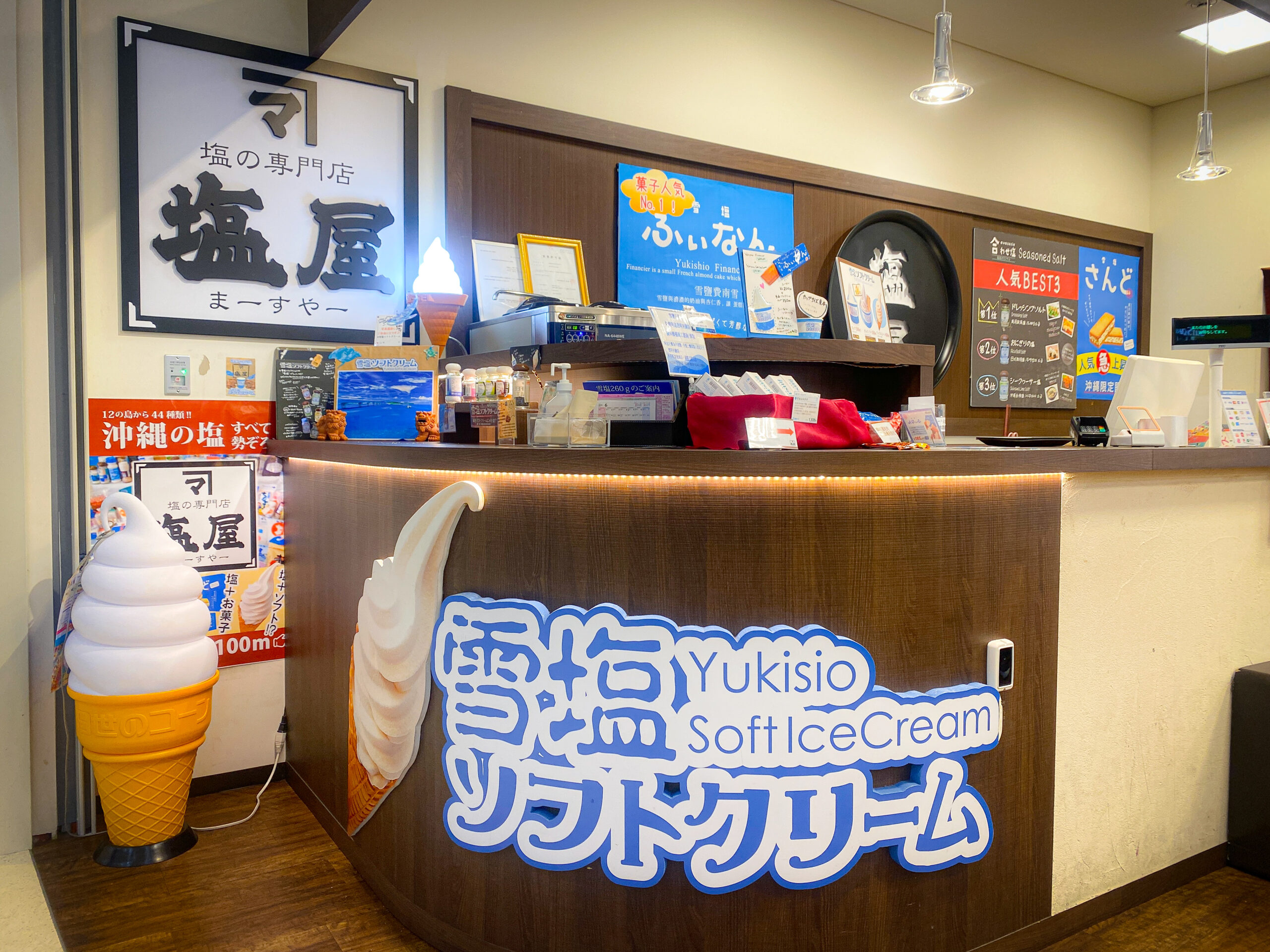 那覇の初日、あるいは最終日に立ち寄りたいのが、那覇空港内にある「塩屋(まーすやー)」。「空港でも沖縄を満喫したい」という人にピッタリな店舗です。宮古島産の雪塩を使用した、甘くてしょっぱいソフトクリームはクセになること間違いなし。