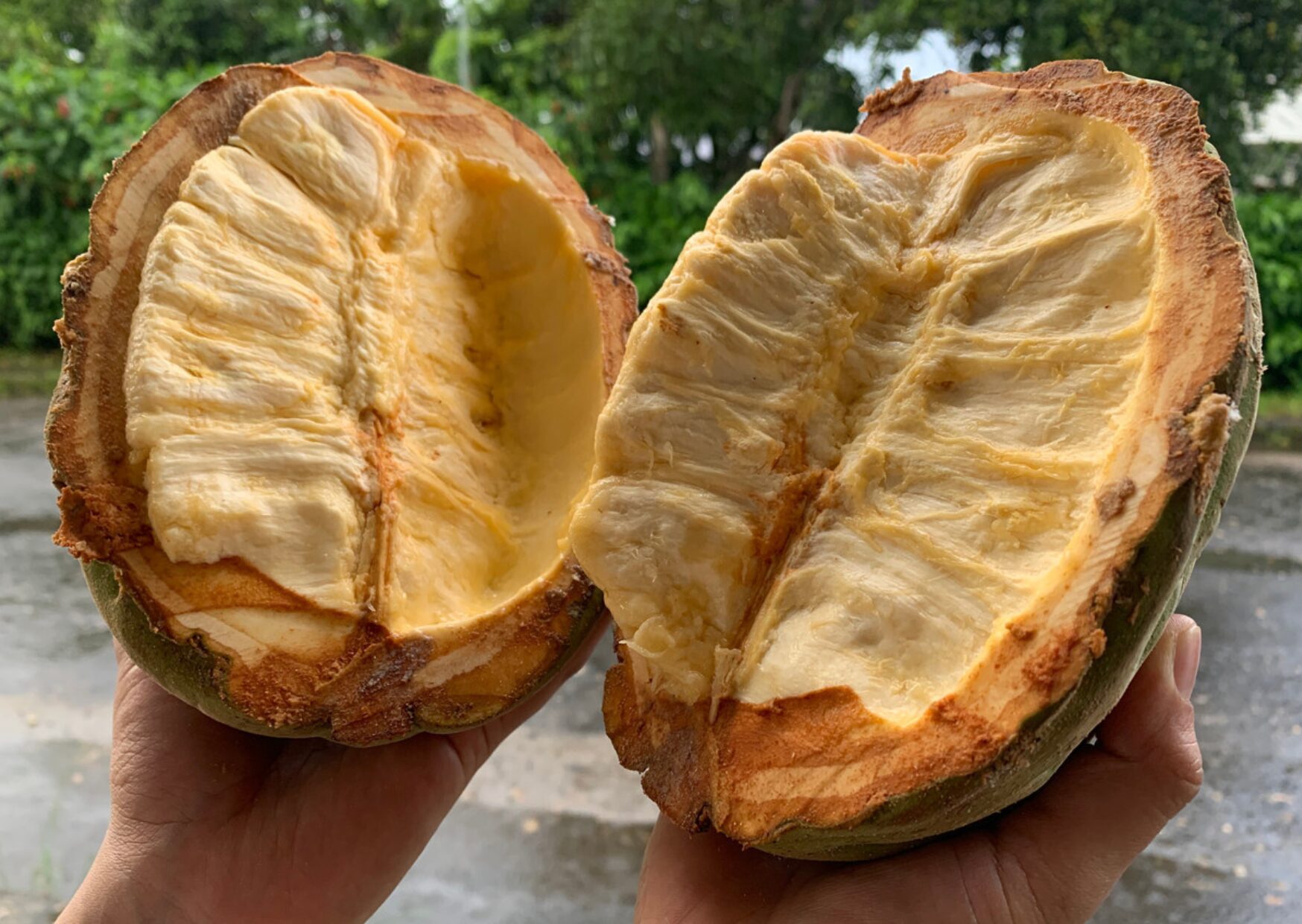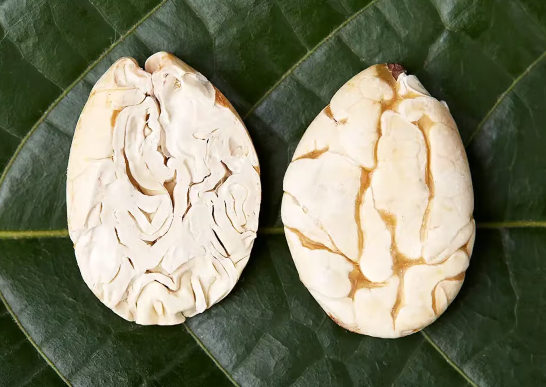 マハンボはカカオと似ていますが、より大きく扁平で、白い種子を持ちます。果実の内部には白い繊維質の果肉と一緒に種子がきっしり詰まっています。