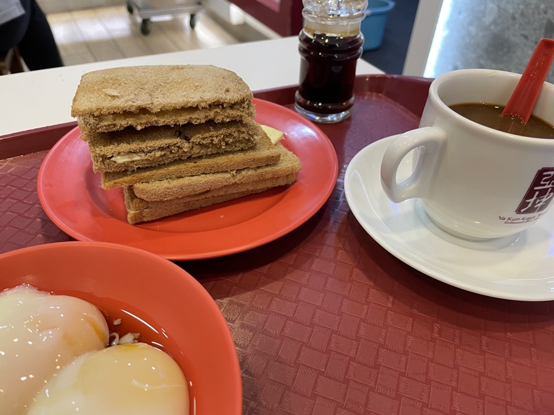 1944年創業のカヤトーストの名店、Ya Kun Kaya Toast。筆者はカヤトーストバターセット(6.30シンガポールドル)を注文しました。温泉卵ほどのトロトロの卵に醤油をかけ、カヤトーストにつけてもおいしかったです。コーヒーはシンガポールコーヒーのコピで練乳入りなので、少し甘め。独特なコーヒーの味でサクサクのトーストと合いました。シンガポール内に70店舗以上ありますので、見つけたら、ぜひ味わってみてください。